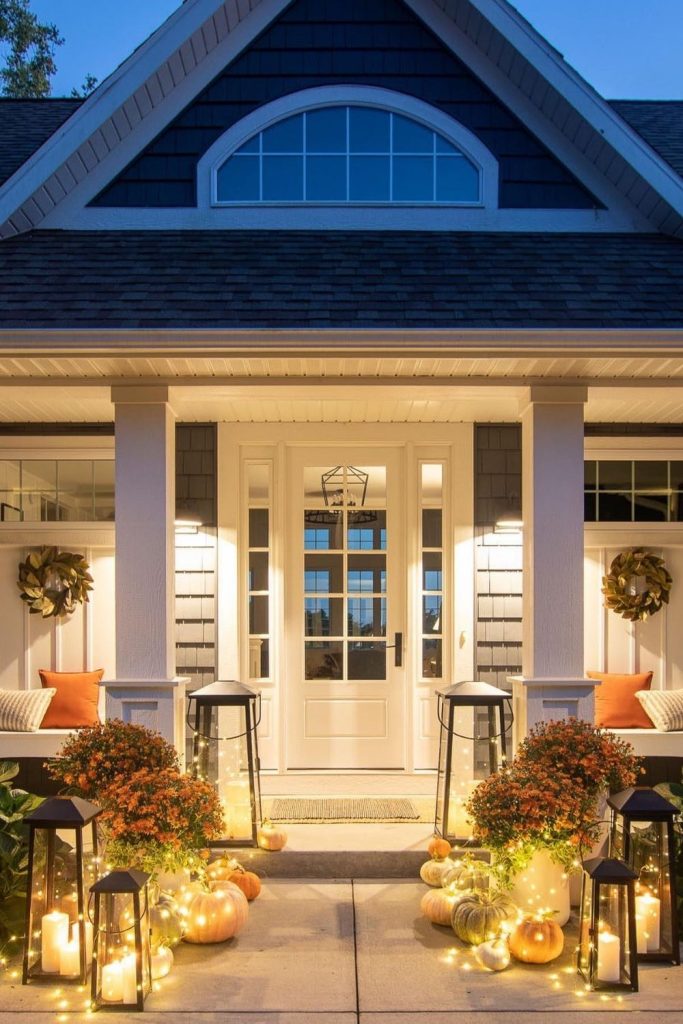 This porch blends rustic charm and elegance. A wooden crate holds soft orange pumpkins. A warm lantern lights the space. A wreath with dried leaves and berries adds a nice touch. I love this cozy and refined setup. I like using natural things for a timeless look. Try crates and lanterns for your porch! Like this rustic look? Pin it or share your fall tips in the comments!