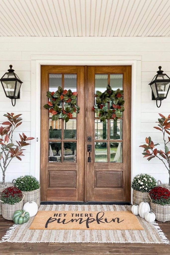 This porch feels calm and elegant. Two urns with red mums sit beside a sleek door. A garland with dried leaves hangs over the entry. A white pumpkin adds a fresh touch. I like polished looks like this. It mixes fall charm and style. Classic planters give a timeless feel. This look is great for a chic fall update. Like elegant decor? Share on social media or tell us your porch tips!