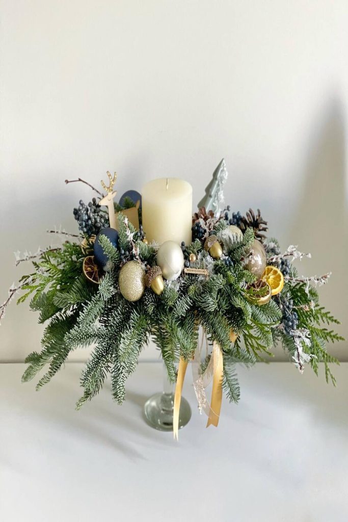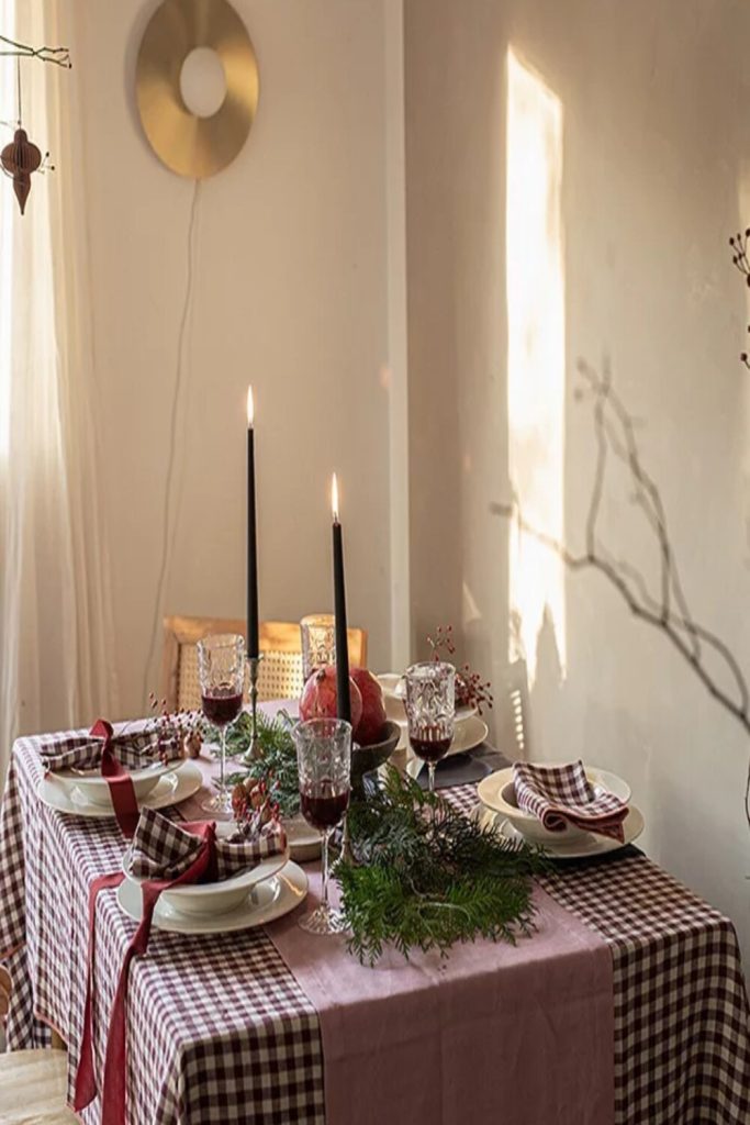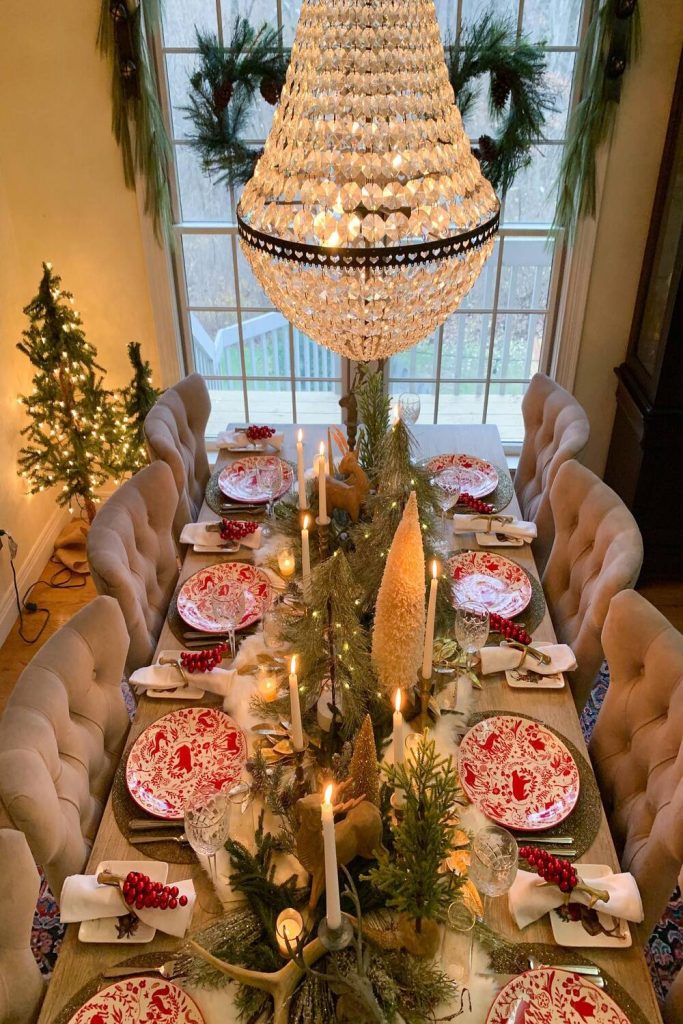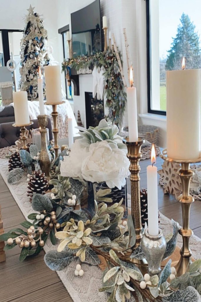 This Christmas table centerpiece is pure holiday magic. Evergreen branches weave around tall candles, creating a warm, inviting glow. The natural greenery aligns with sustainable decor trends, bringing the outdoors in. I’m obsessed with how the soft candlelight dances across the table, perfect for intimate holiday dinners. Add a few pinecones for extra texture. This look is simple yet stunning, and you can recreate it with foraged materials. Pin this for inspiration and let me know how you’d style this for your holiday table!