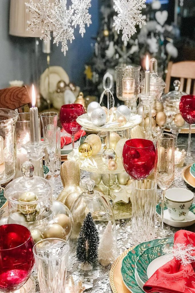 This Christmas table centerpiece is a cool, calming masterpiece. Icy blue ornaments and silver accents sit atop a snowy white runner, evoking a winter wonderland. The serene palette feels fresh and modern, perfect for a chic holiday gathering. As a decor lover, I’m drawn to how the metallic touches add subtle sparkle without overwhelming the table. Pair with crisp linens for a polished look. Want to bring this frosty vibe to your home? Try it and share your thoughts below—let’s inspire each other with holiday tablescape ideas!