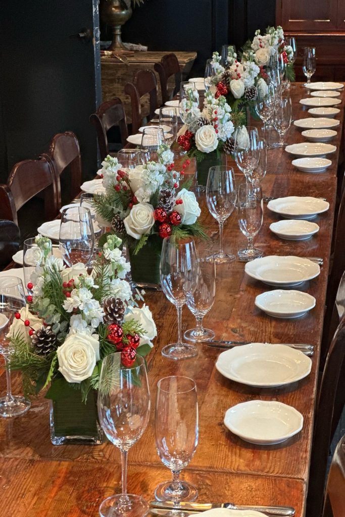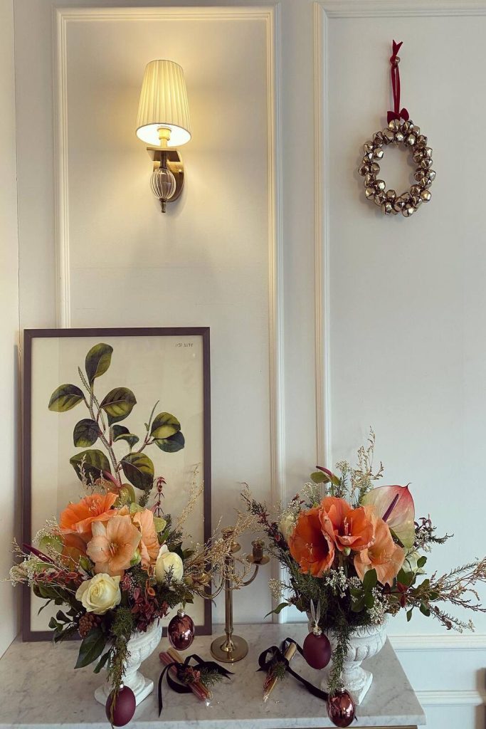 This Christmas table centerpiece is effortlessly chic. A simple garland of evergreen branches runs down the table, dotted with small candles for a warm glow. The natural look aligns with sustainable decor trends, bringing the outdoors in. I’m obsessed with how the greenery adds freshness without overwhelming the table. Perfect for a minimalist holiday dinner, this setup is easy to recreate with foraged branches. Pin this for inspiration and share your favorite ways to keep your holiday table simple yet stunning!