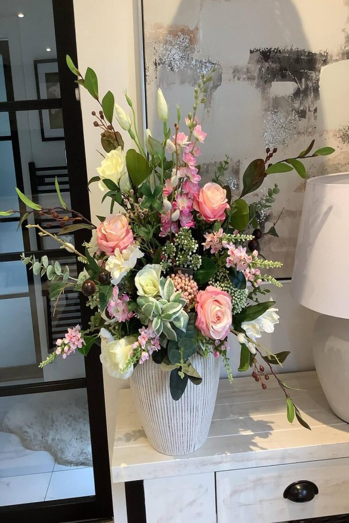 Combining the silvery-green leaves of eucalyptus with soft cream roses is my go-to for a sophisticated, modern palette. The eucalyptus provides a lovely drape and a fresh, spa-like aroma, while the roses add that classic beauty. I find this combination works beautifully in a matte black vase to create a bit of edge. It’s a look that feels very “grown-up” and curated, making it perfect for a formal dining room or a primary suite dresser.
