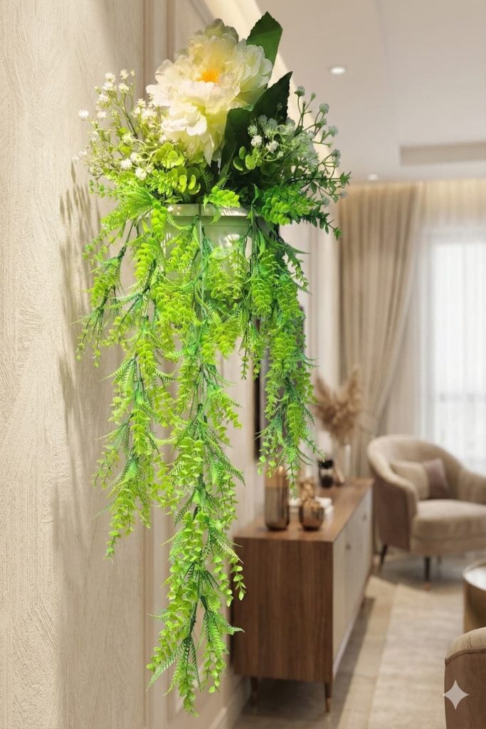 Sometimes the best “flower” decor isn’t a flower at all. A single, massive Monstera leaf in a tall glass cylinder filled with clean water is a stunning, low-maintenance statement. This look is perfect for mid-century modern homes or anyone wanting a “jungle chic” vibe. These leaves can stay green and fresh for weeks if you change the water regularly. I love how the light passes through the glass and highlights the unique cut-outs of the leaf. It’s bold, architectural, and very on-trend right now.