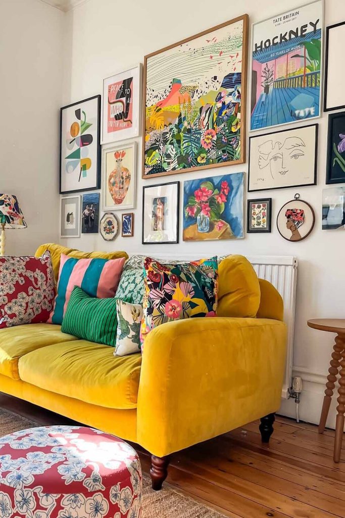 6. Rust-Colored “Bloom Where You’re Planted” Over Velvet Emerald Sofa