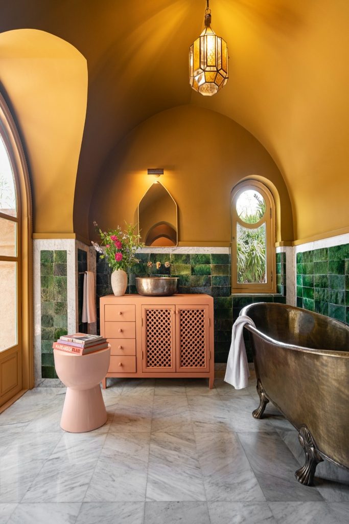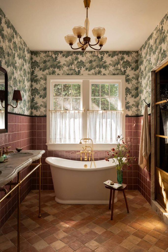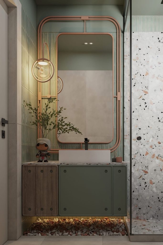 We’re seeing a huge move toward “open-concept wet zones” where the shower and tub share the same tiled area. It creates a seamless, “clutter-free” look that is very easy on the eyes. This specific design uses “terrazzo flooring” with bits of green and brown marble, pulling in those “nature-inspired hues.” Pro tip: Adding a “wooden stool” next to the tub is a small touch that provides a spot for your tea or book, making the space feel lived-in and intentional.