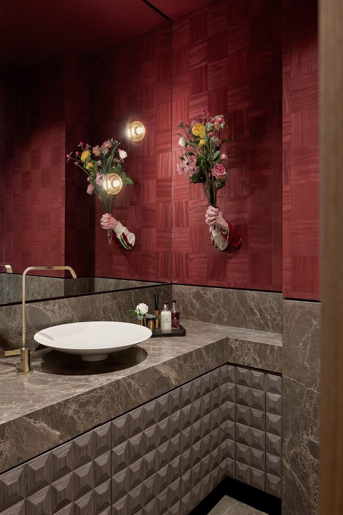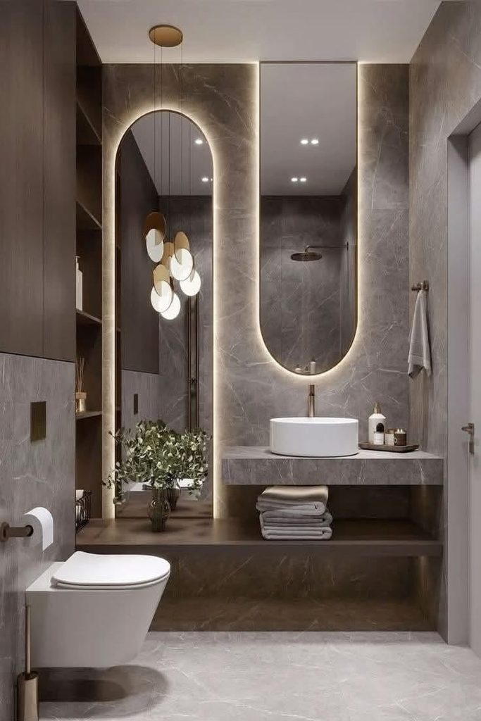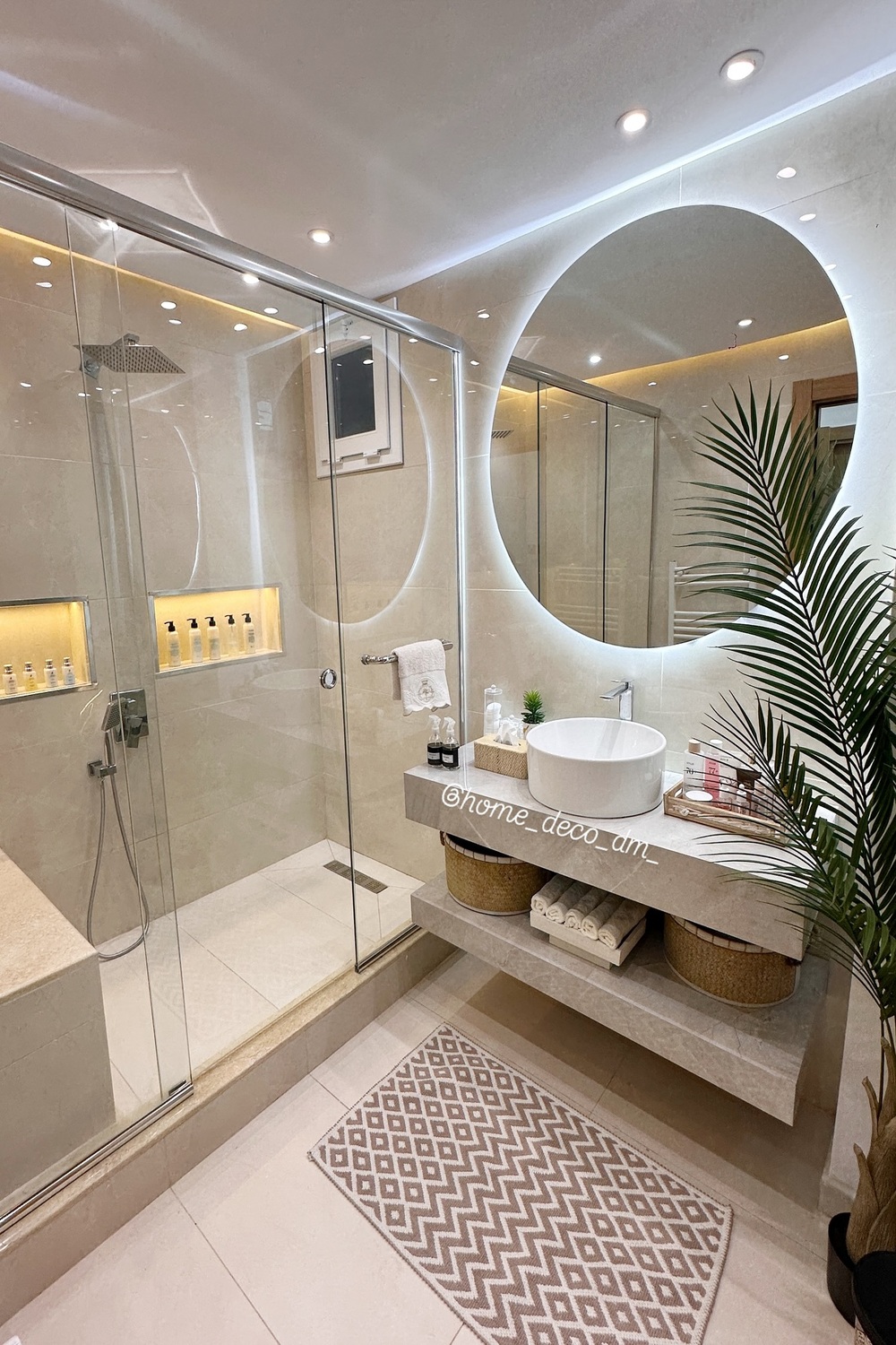 “Textured tiles” are a massive trend right now. These “fluted wall tiles” add depth and play with the light in such a beautiful way. Paired with a “backlit round mirror,” the room feels soft and ethereal. It’s a great example of “cozy minimalism”—where the beauty comes from the materials themselves rather than “extra decor items.”