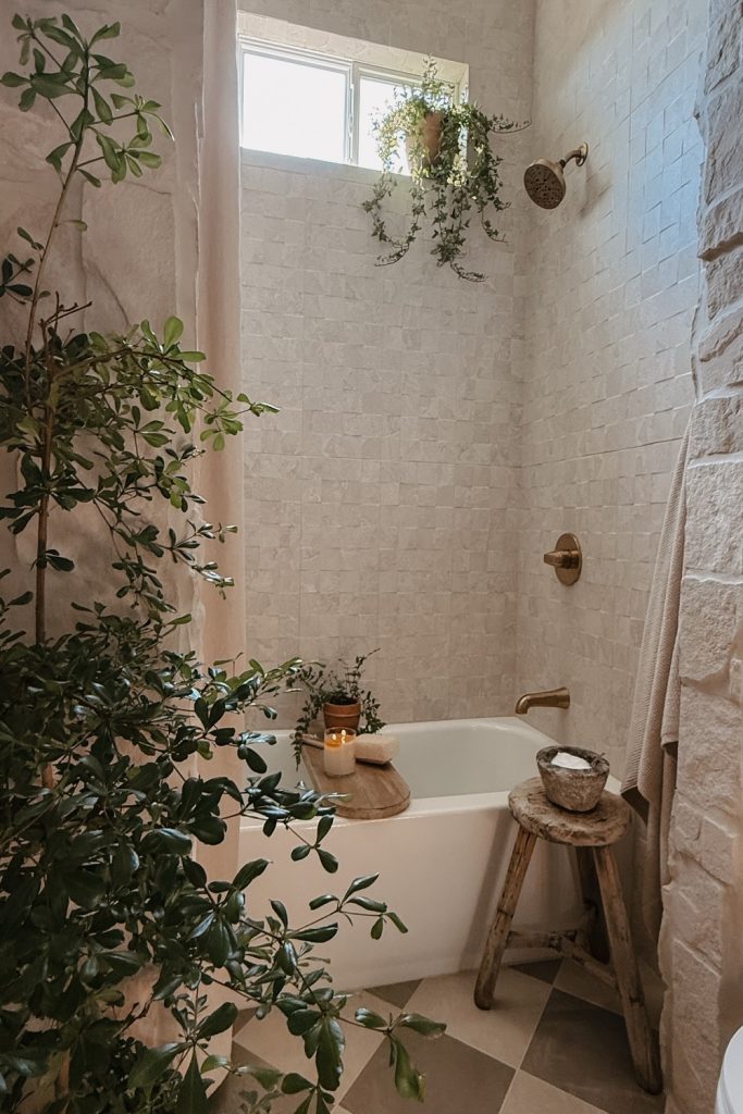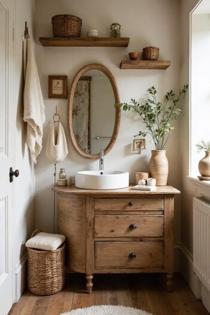 I am a huge advocate for “upcycling” and using “reclaimed wood” in garden-style decor. This vanity was clearly a piece of old timber, and the knots and grains tell a story. It adds so much “character and warmth” to the bathroom. Adding a few “potted succulents” on top completes the “earthy, organic vibe.”