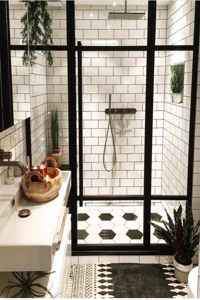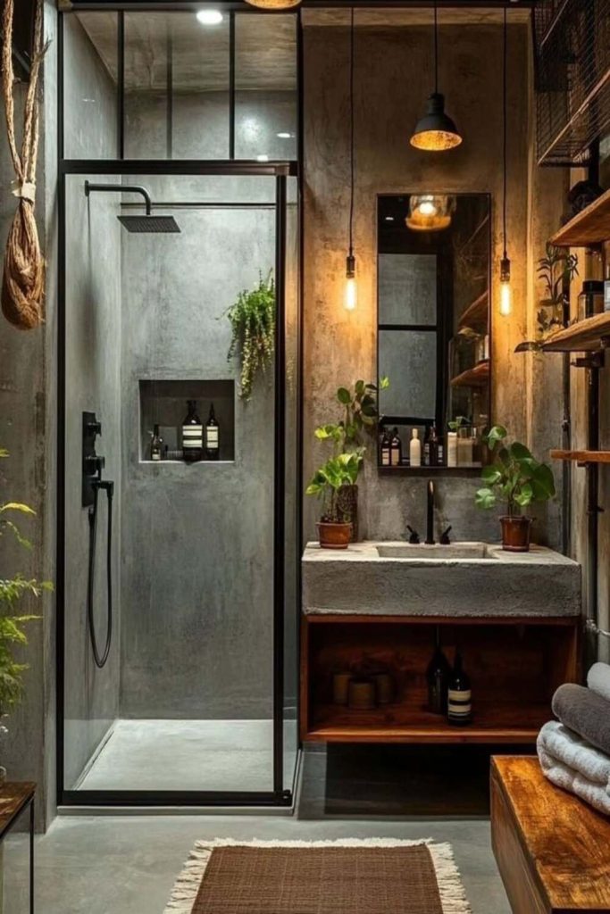 Don’t let a small floor plan stop you from going green. This “vertical garden” setup uses wall-mounted planters to create a lush backdrop for the shower. Using “moisture-loving plants” like ferns and spider plants ensures they thrive in the humidity. It’s a brilliant way to incorporate “biophilic design” when you don’t have room for large pots. The “reclaimed wood” accents on the mirror frame tie the whole “earthy aesthetic” together beautifully.