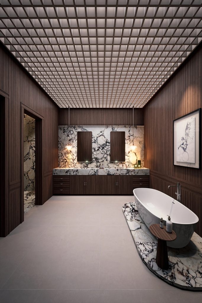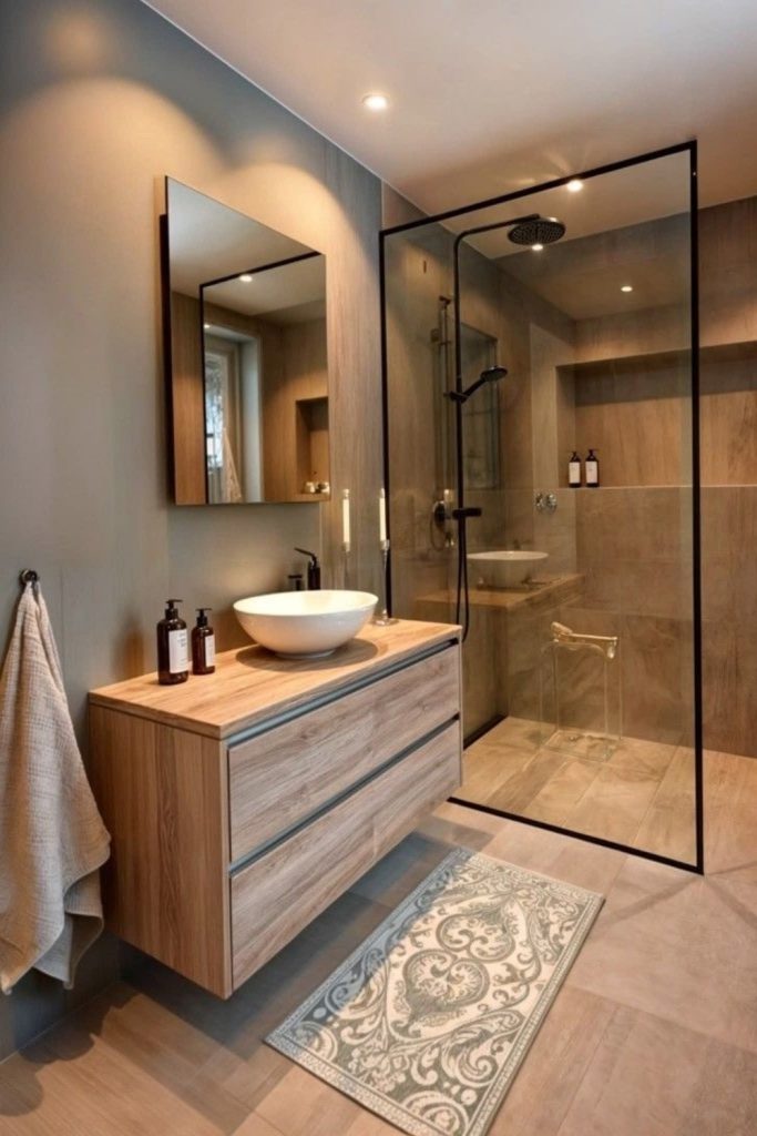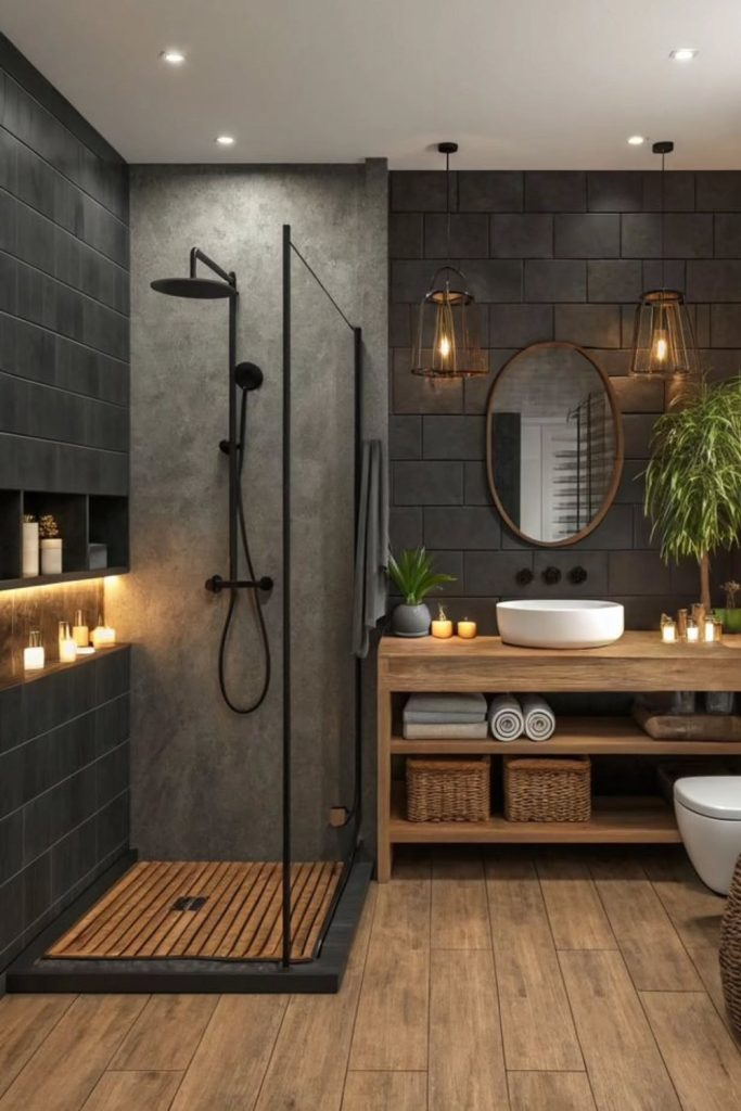 This “Japandi” style bathroom blends the functionalism of Scandi design with the aesthetic “minimalism” of Japan. The “slatted wood ceiling” is a genius way to add architectural interest and warmth to a room that usually feels “cold” due to all the tile. I’m a huge fan of the “integrated aromatherapy” here—a small niche specifically for essential oils and candles. It’s all about creating a “multi-sensory experience” that calms the mind after a long day.
