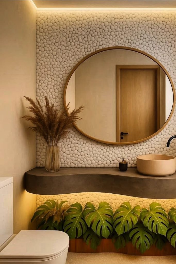 If you’ve ever walked on sun-warmed stones, you know that tactile sensation is instant zen. This design uses a “pebble walkway” around a freestanding bathtub, creating a sensory experience every time you step out of the water. The use of “sustainable teak wood” for the bath caddy and shelving adds a layer of warmth that balances the cool grey of the stone. It’s a perfect example of how “natural materials” can turn a standard bathroom into a high-end spa.