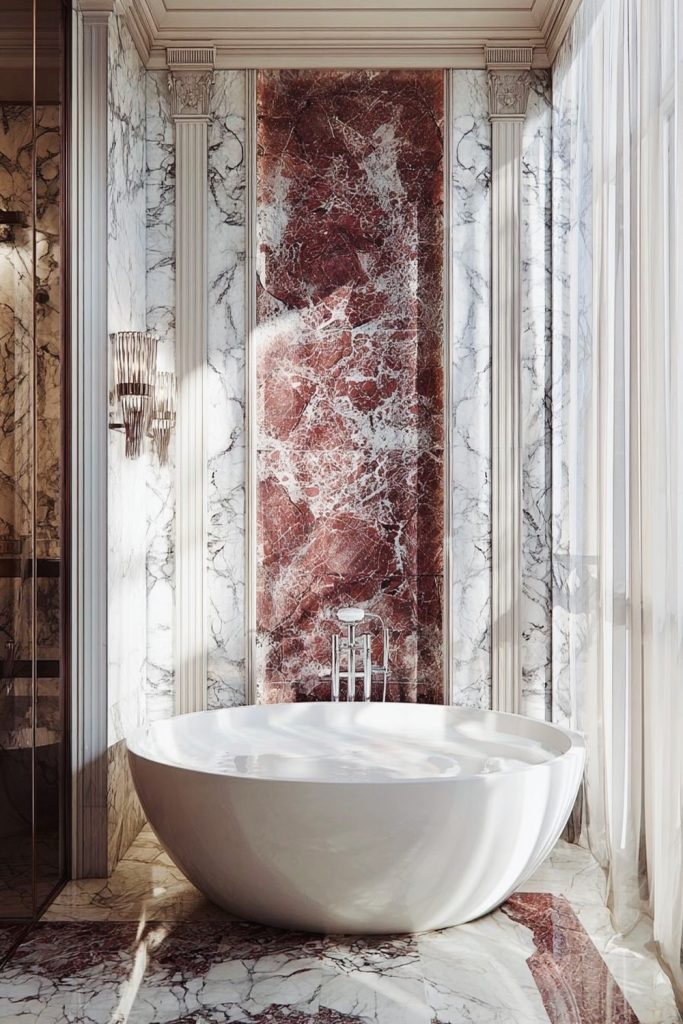 Marble often feels very formal, but when used in a “matte finish” like it is here, it feels like raw stone. The “built-in niche” for soap and sponges keeps the “minimalist aesthetic” intact by hiding clutter. I love the addition of a single “hanging eucalyptus bunch” over the showerhead. When the steam hits it, it releases a natural scent that’s better than any store-bought air freshener.