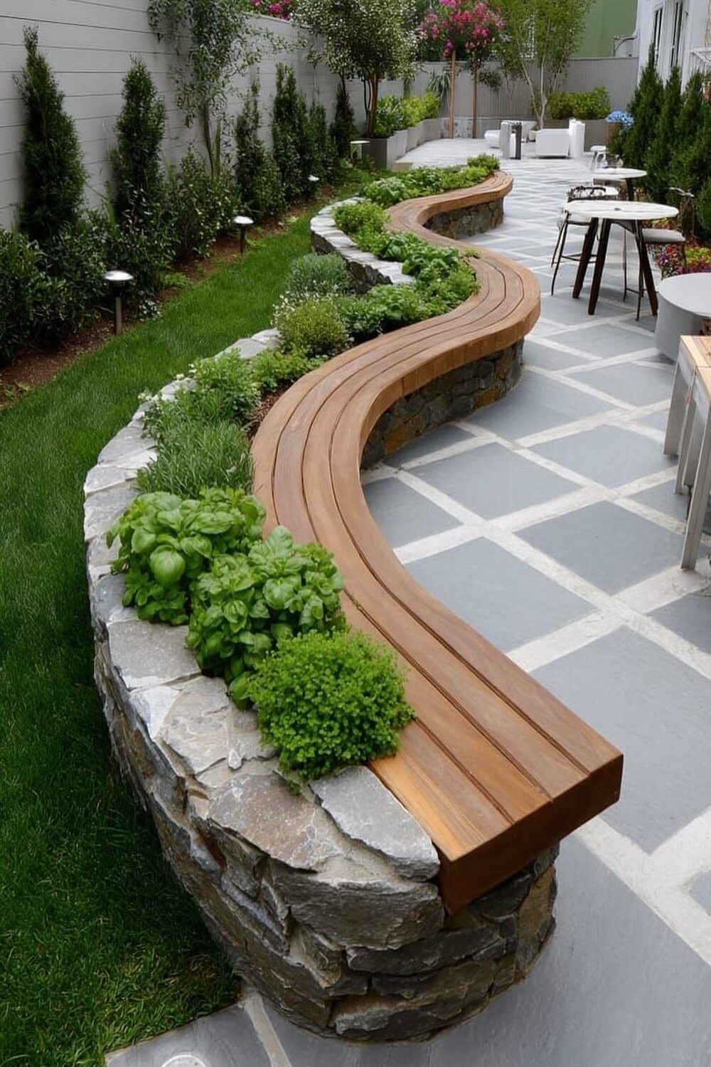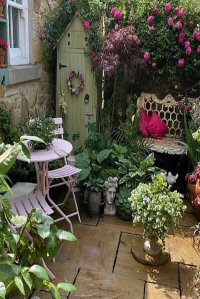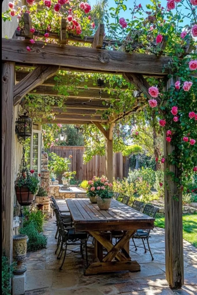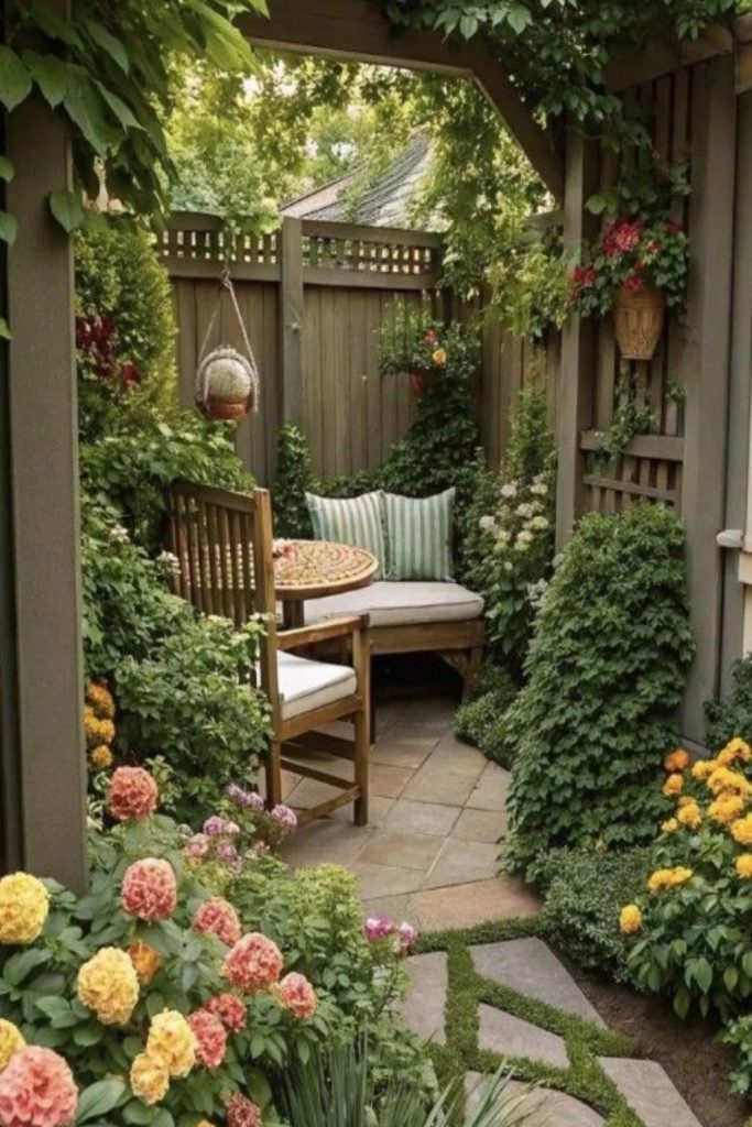 This yard makes me want to eat out now! The small lights in the dark sky look like magic. To get this look, use a big wood table. Use many types of chairs for a fun feel. I like to use real glass and cloth mats. This makes a meal feel special. It is more than just a cookout. With good light and herbs, your yard feels like a top café.