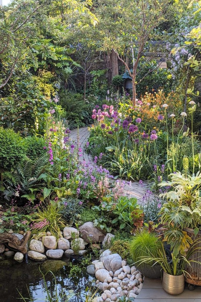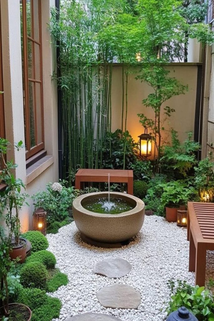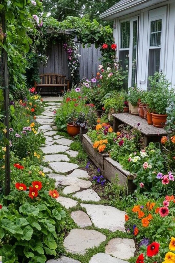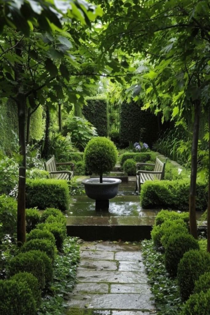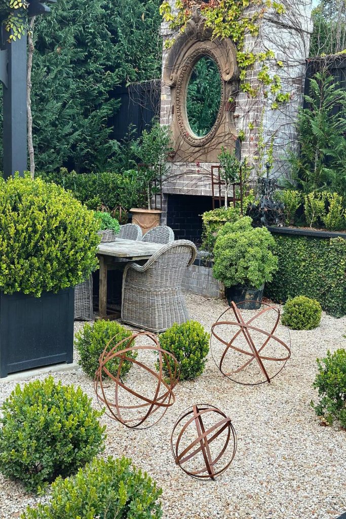 This yard makes me want to eat out now! The small lights in the dark sky look like magic. To get this look, use a big wood table. Use many types of chairs for a fun feel. I like to use real glass and cloth mats. This makes a meal feel special. It is more than just a cookout. With good light and herbs, your yard feels like a top café.