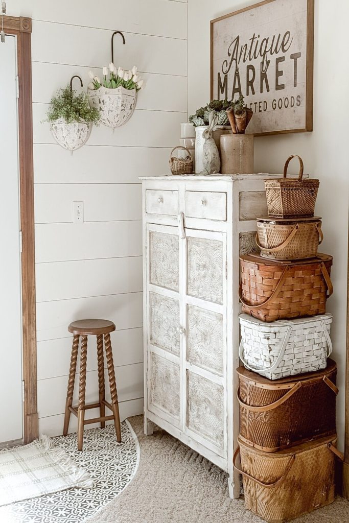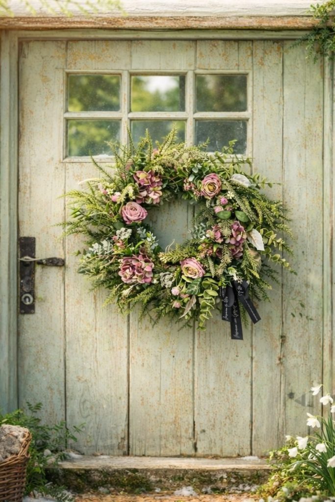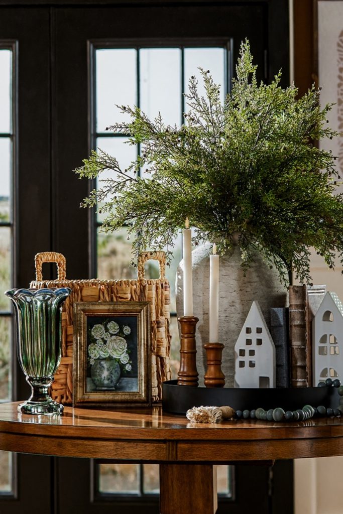 19. Eclectic Entryway Styling with Patterned Foliage