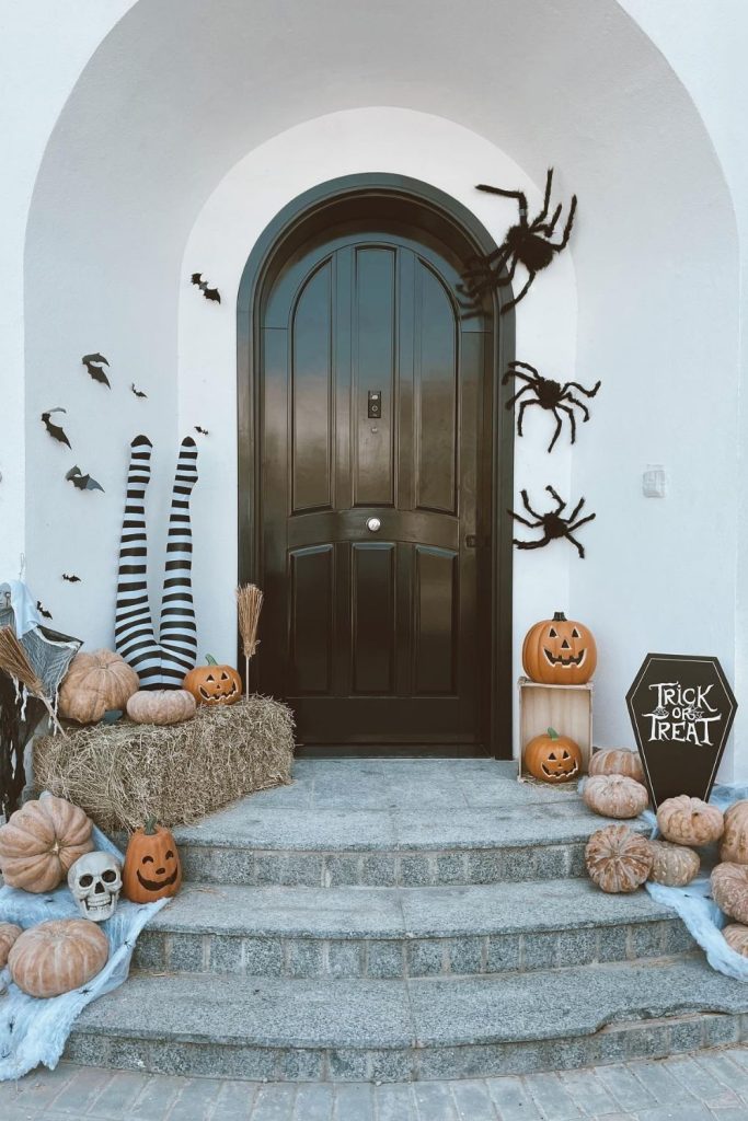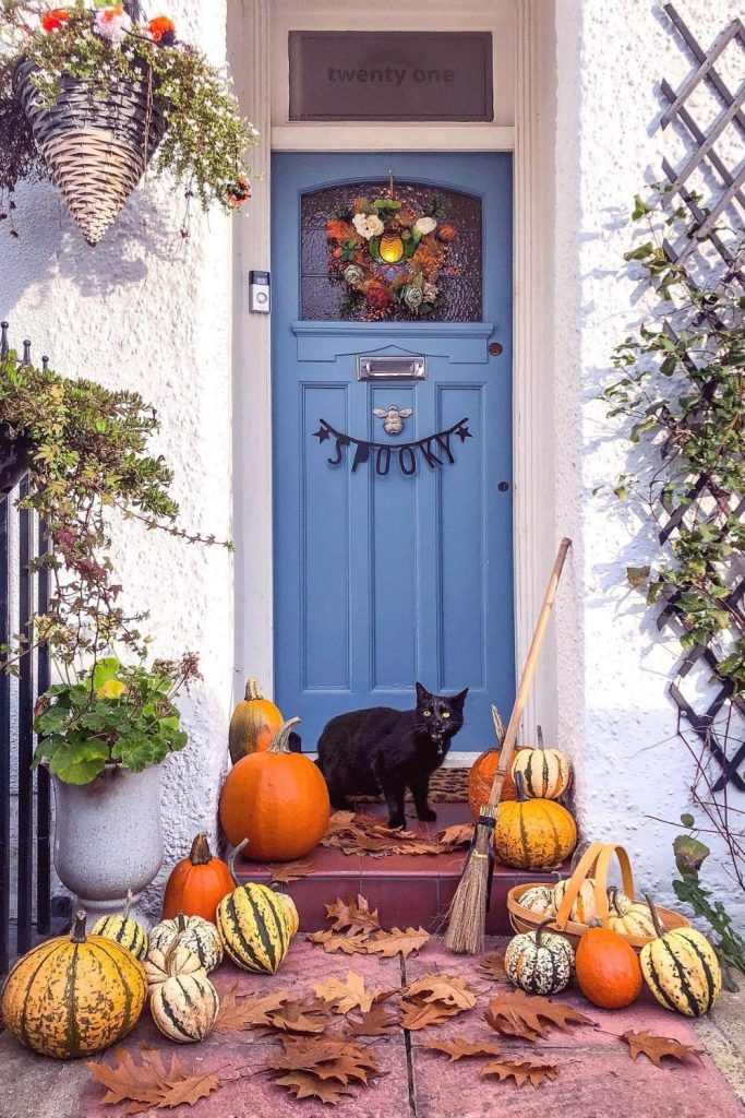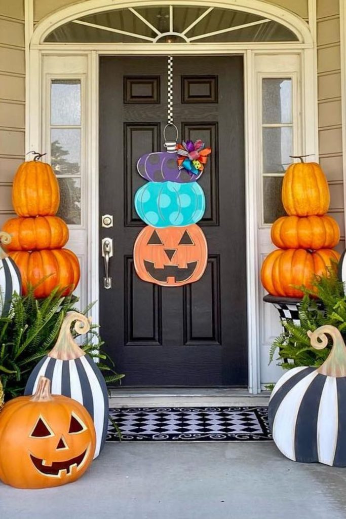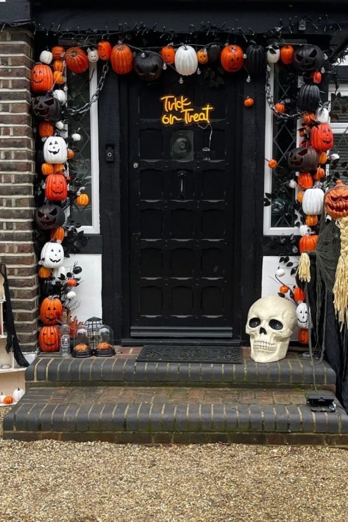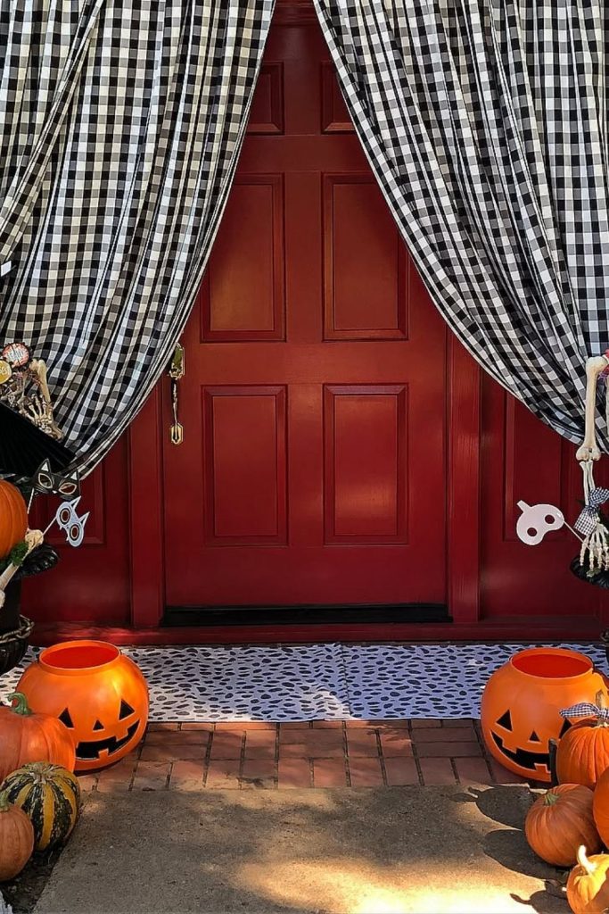 This door shines with cozy fall style! Bright orange and white pumpkins stack by the door with a straw wreath of dried leaves. It’s a natural, green look for a warm Halloween. Add a plaid doormat for charm. Want a simple, cheap update? Try it! Share your pumpkin ideas!