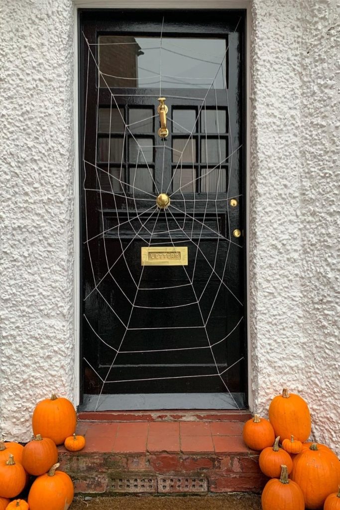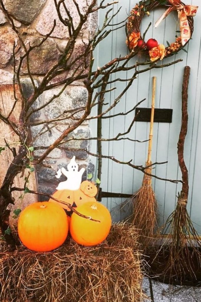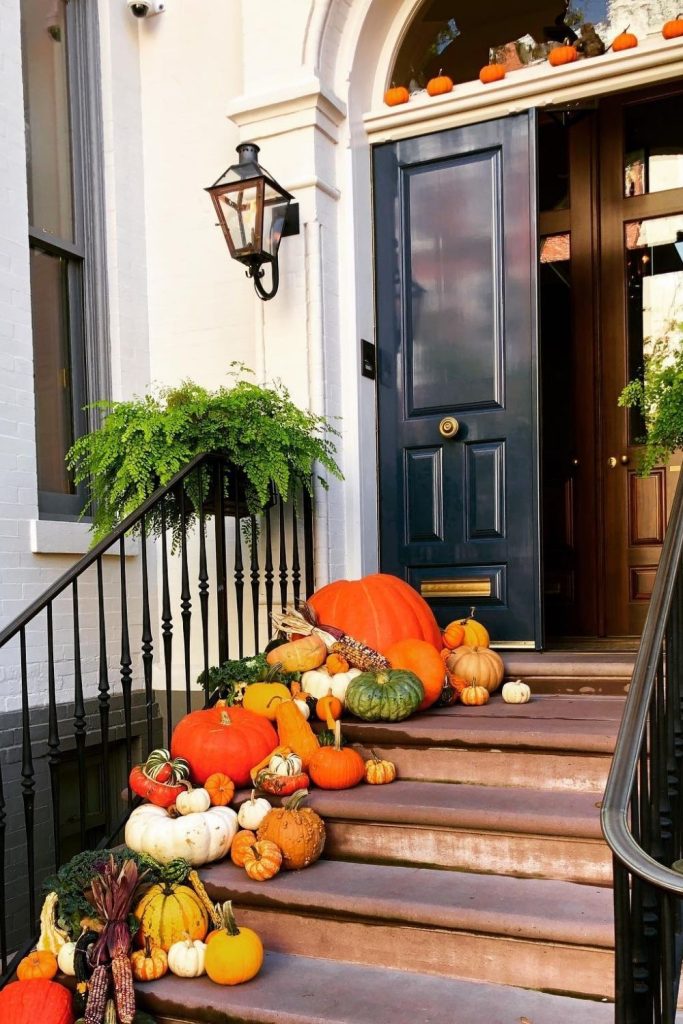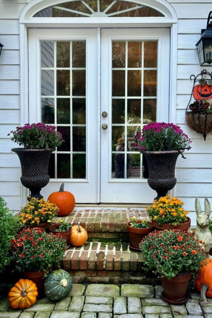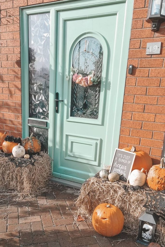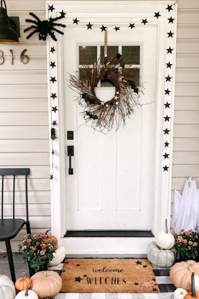 This door shines with cozy fall style! Bright orange and white pumpkins stack by the door with a straw wreath of dried leaves. It’s a natural, green look for a warm Halloween. Add a plaid doormat for charm. Want a simple, cheap update? Try it! Share your pumpkin ideas!
