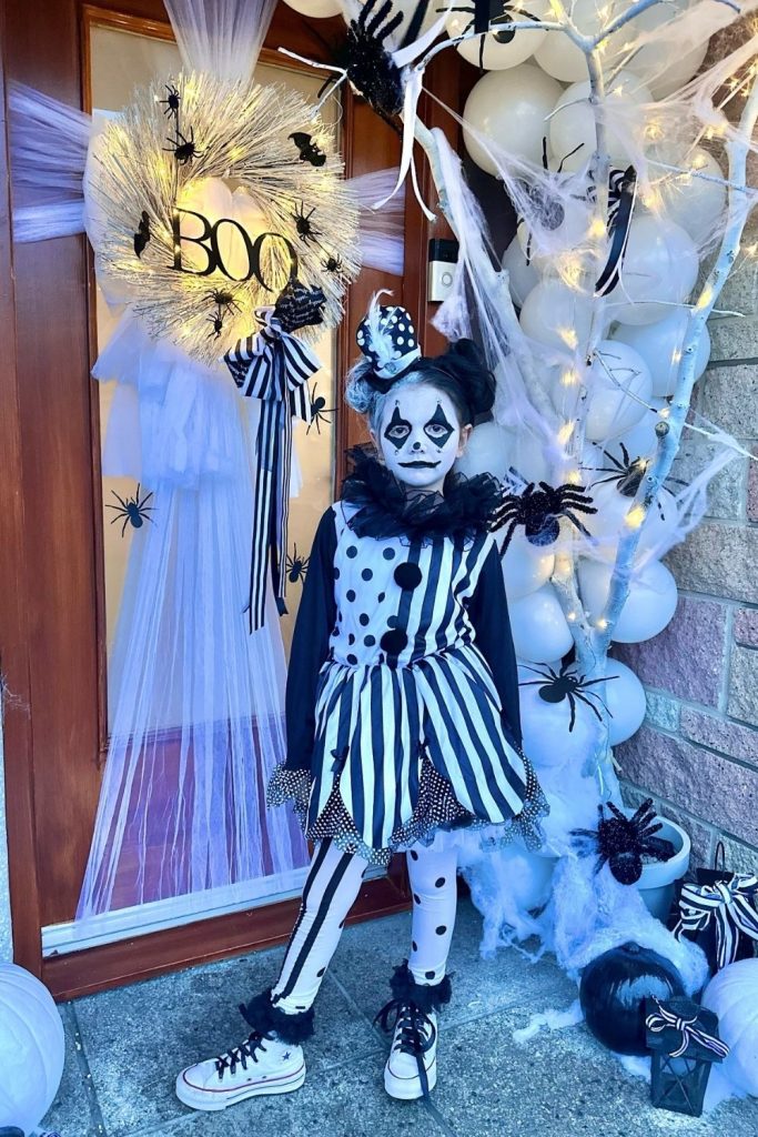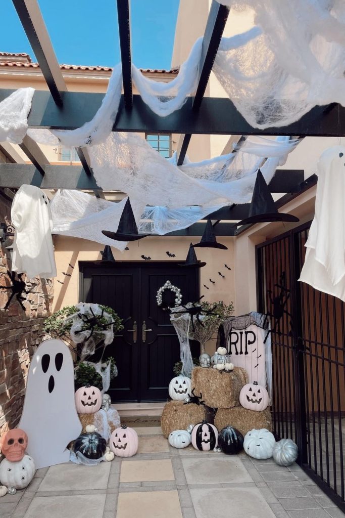 This chic Halloween door is simple and spooky! A black wreath with skulls hangs on a white door, showing a cozy, minimal look. The black-and-white style is modern, perfect for small spaces. One black pumpkin adds charm. You don’t need clutter to shine. Want this sleek look? Save it and share your ideas!