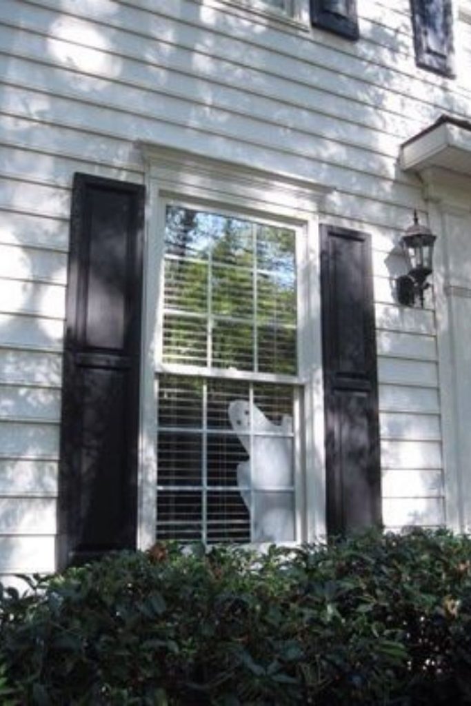 This door has ghosts! It has a ghost garland and pumpkin wreath. It’s cheap and easy. Ghosts add fun for Halloween. Want this? Save it and share kid tips!