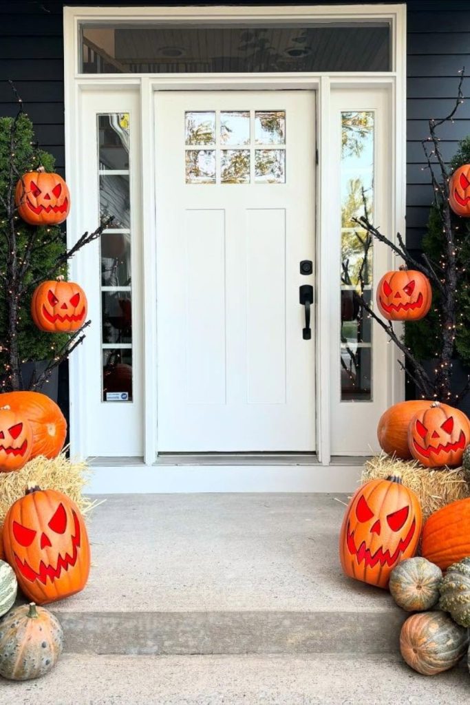 This door glows! Pumpkins light the entry. A burlap wreath feels cozy. It’s classic for nights. Use safe candles. Like it? Save this and share pumpkin tips!