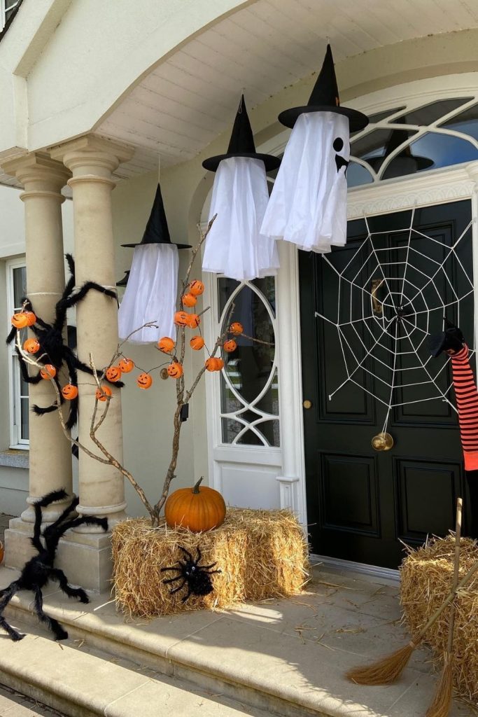 This door is magic! A broom and feather wreath look spooky. It’s simple and easy. Add a pumpkin. Want it? Save this and share witchy tips!