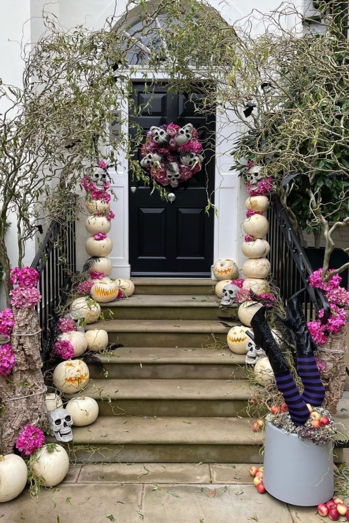 This door is boho! A wreath with flowers and skulls looks cool. Soft colors and orange feel trendy. Small pumpkins add fun. Like boho? Save this and share your style!