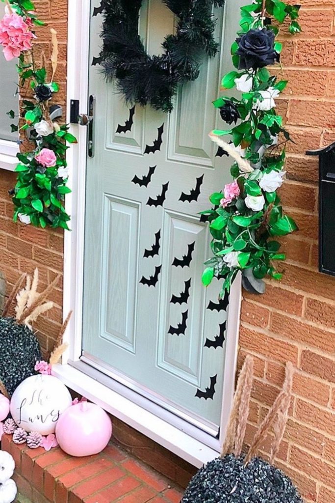 This door glows with black bats on a bright orange background. The bold look is fun but simple, staying stylish. A big bat wreath adds drama without mess. Perfect for modern homes, it’s easy with craft supplies. Want a bold Halloween? Save it and share your decor ideas!