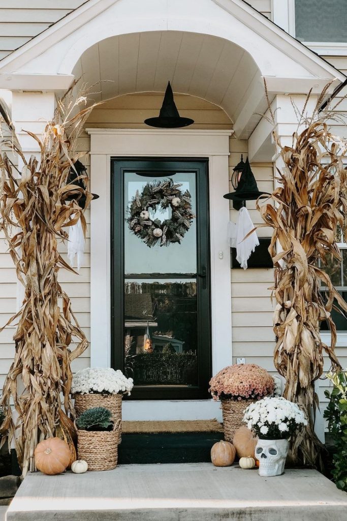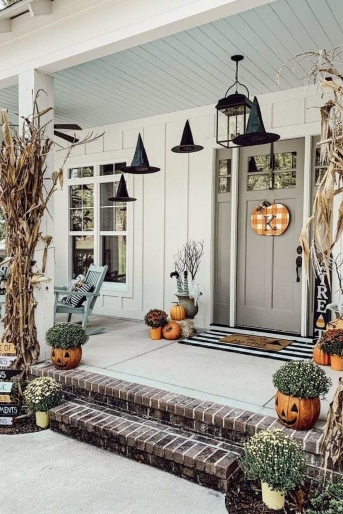 This porch is sleek and modern. Black, white, and gray pumpkins create a chic Halloween vibe. Minimalist lanterns and a welcome mat complete the look. Neutral colors feel fresh and festive. This works well for small spaces or city homes. Paint old pumpkins for a sustainable update. Want a modern Halloween look? Share your ideas and pin for the season.