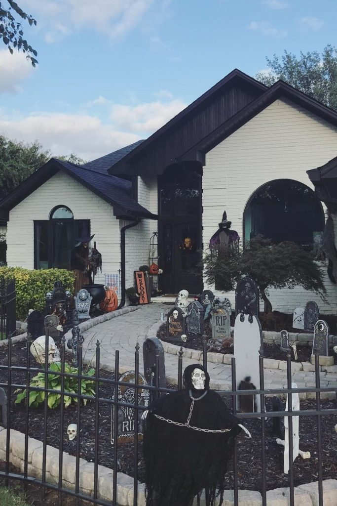 This porch is a haunted masterpiece! Mini tombstones, cobwebs, and glowing skulls make a creepy graveyard. The dim light and eerie accents look like a movie set. Weathered textures add a real touch. Pro tip: Use recycled materials for tombstones to stay eco-friendly. Want to scare your guests? Try this! Share your spooky decor ideas in the comments and pin for Halloween inspiration.