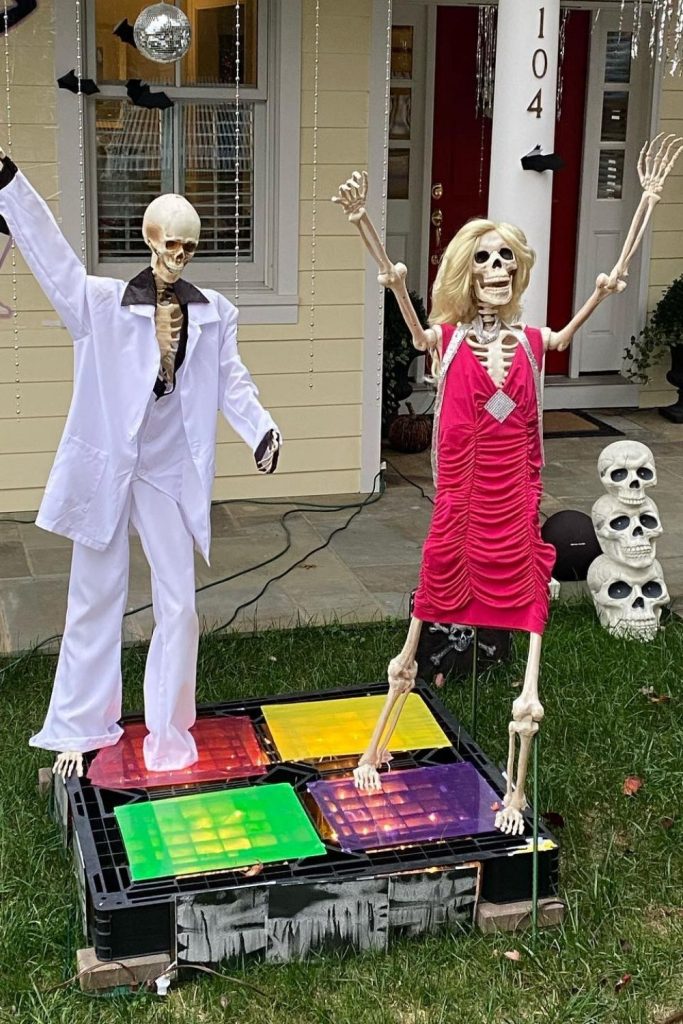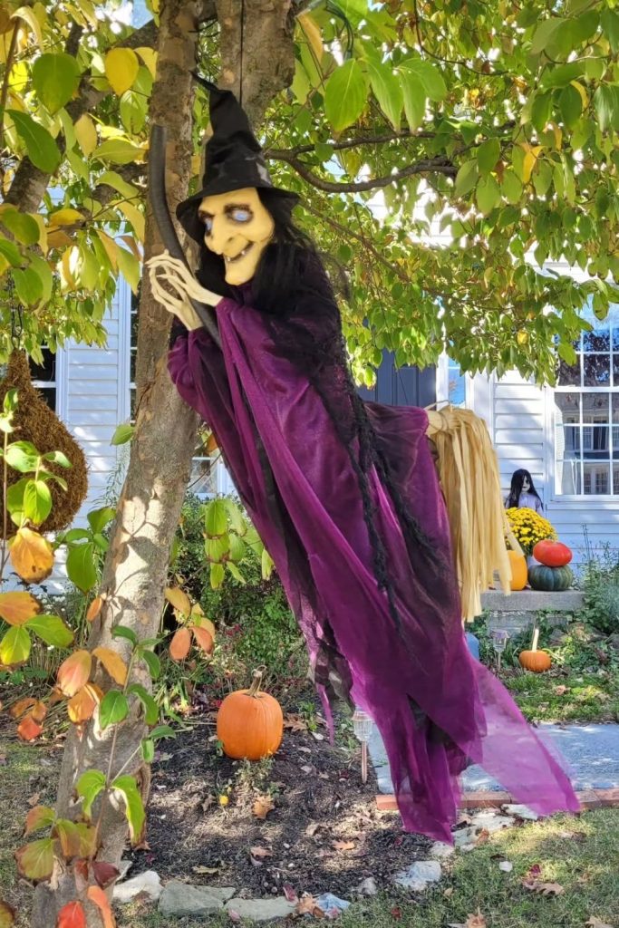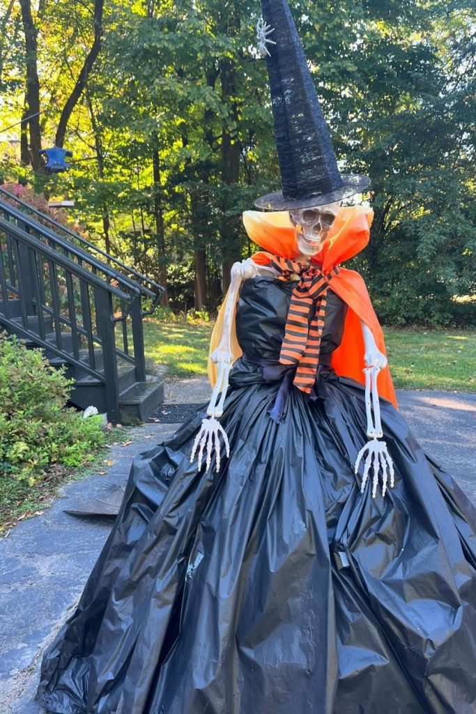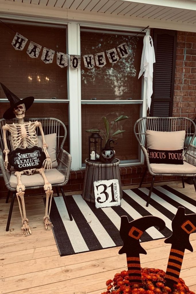This setup is spooky and fun! A skeleton lounges on a porch chair. Cobwebs and glowing pumpkins add an eerie touch. Whimsical and spooky items make a great conversation starter. Cobwebs add texture without crowding the space. Use eco-friendly cobwebs for easy cleanup. This scene is perfect for trick-or-treaters. Share your spooky decor and pin for Halloween ideas.