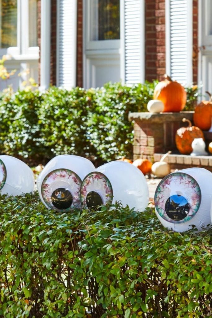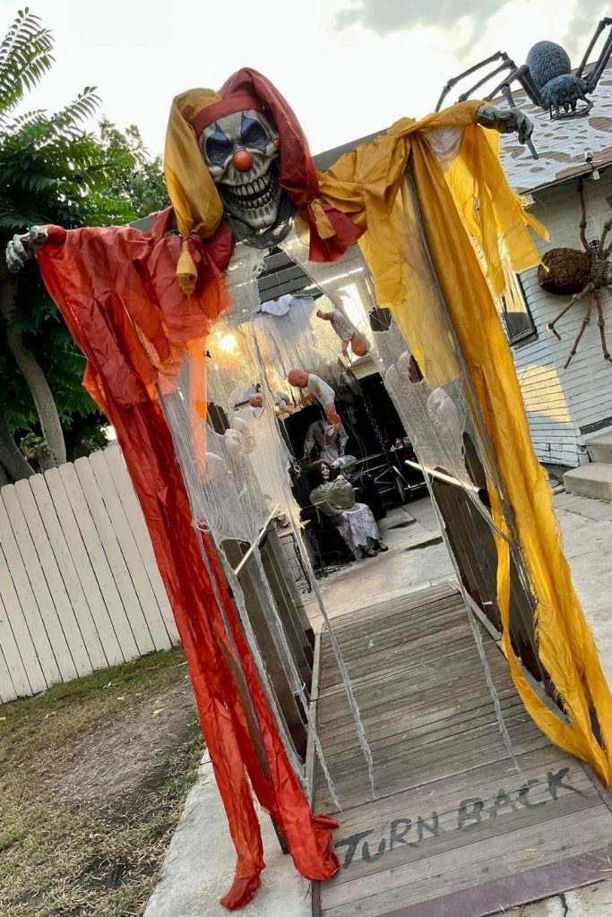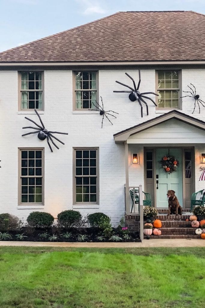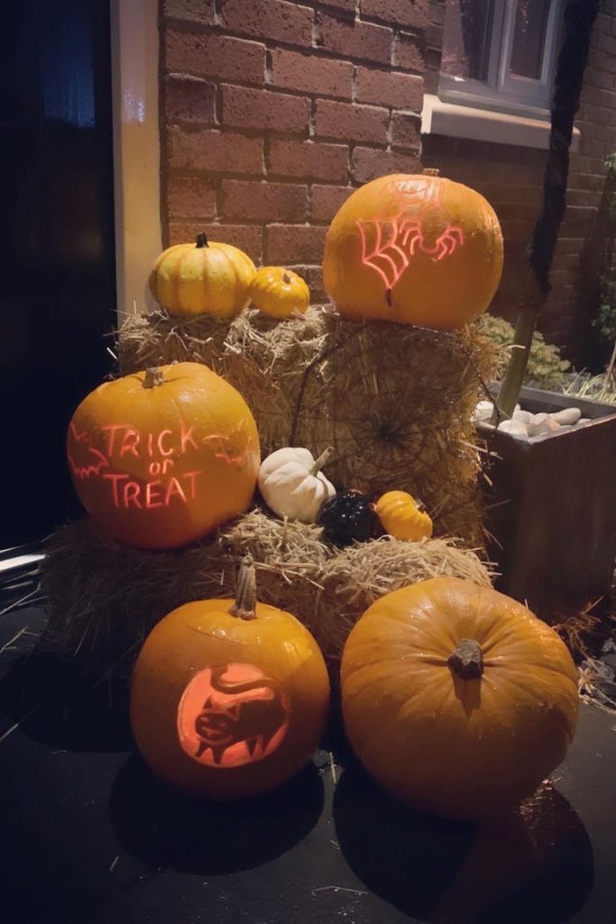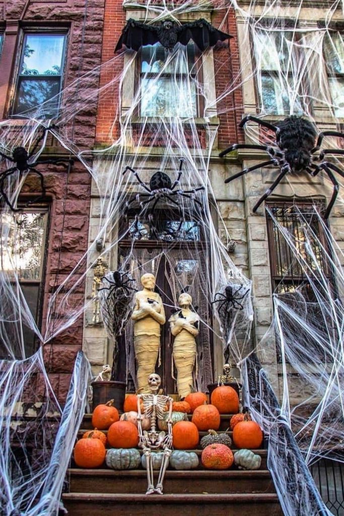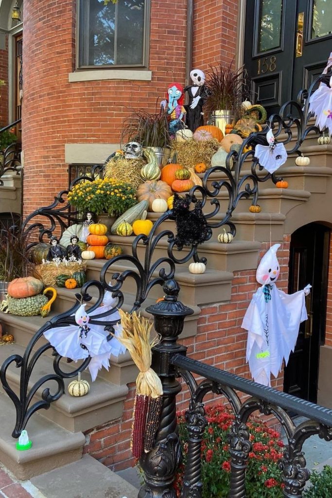 This setup is full of cozy Halloween vibes! A path lined with glowing jack-o’-lanterns carved from real pumpkins leads to your door. Hay bales and a rustic wooden sign make it feel warm and natural. The soft orange light glows in the crisp fall evening. Your porch looks like a countryside haunt. Add burlap accents for extra texture. This look is low effort but high impact! Share your favorite pumpkin ideas in the comments.
