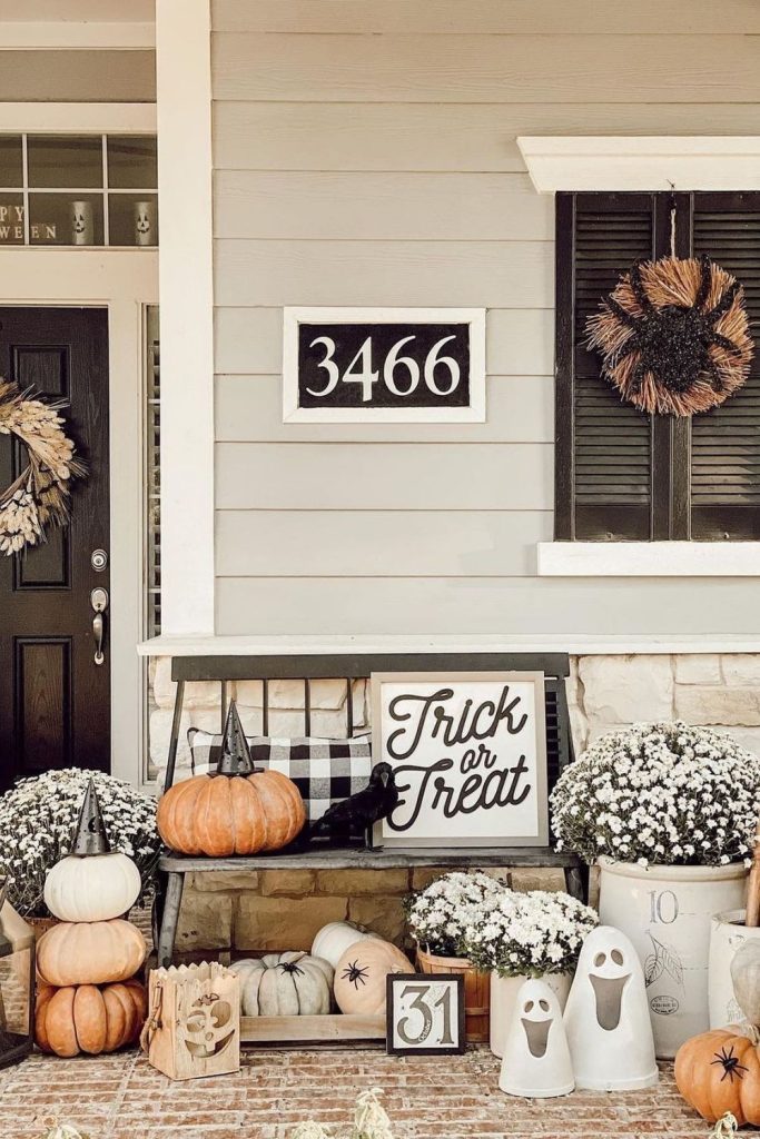 This porch is fall coziness at its best! Orange and white pumpkins, plaid blankets, and a wooden crate create a warm Halloween scene. Colors and textures feel like a crisp autumn day. Plaid adds a homey touch. Pro tip: Thrift blankets for a sustainable setup. Want a cozy Halloween vibe? Try this! Share your favorite fall textures and pin for porch inspiration.