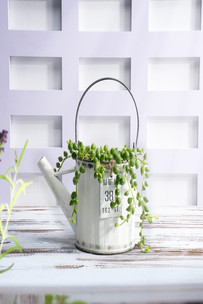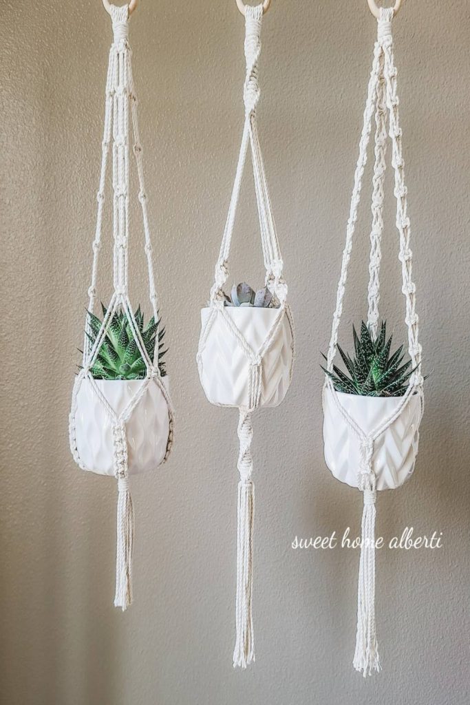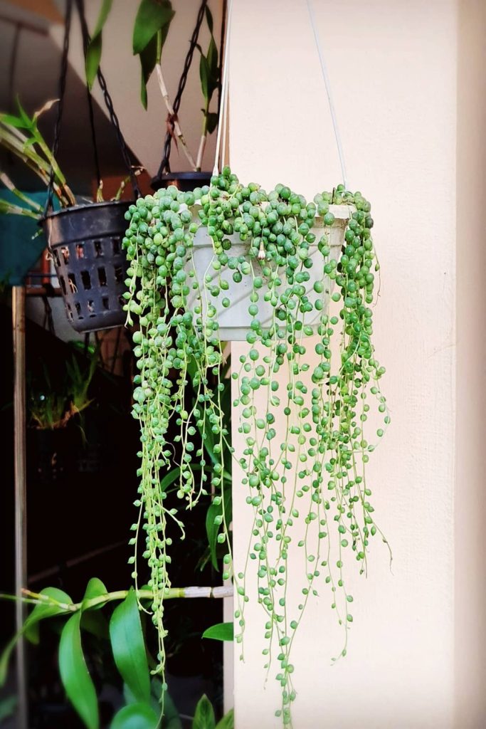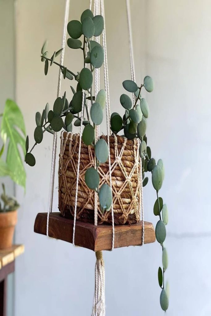 This hanging setup made me try macramé again. A cream rope hanger holds three full pots. They are full of String of Pearls and a thick Burro’s Tail. They hang like green waterfalls. This is great for an empty spot by a window. Mine has been in medium light for two years. It still grows fast. A quick tip: Water only when the pearls look like small raisins!