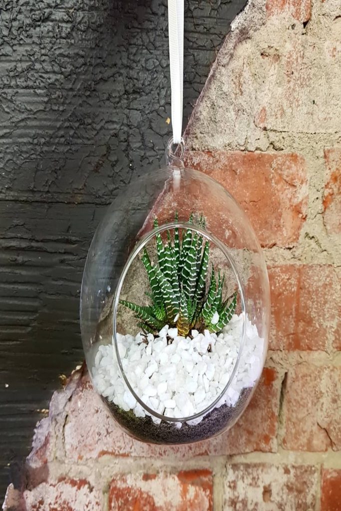 Moss balls with plants inside hang from clear thread. They look like they are floating. They use no pots. This looks amazing. I made six for my dining room. Guests stop and gasp when they see them.