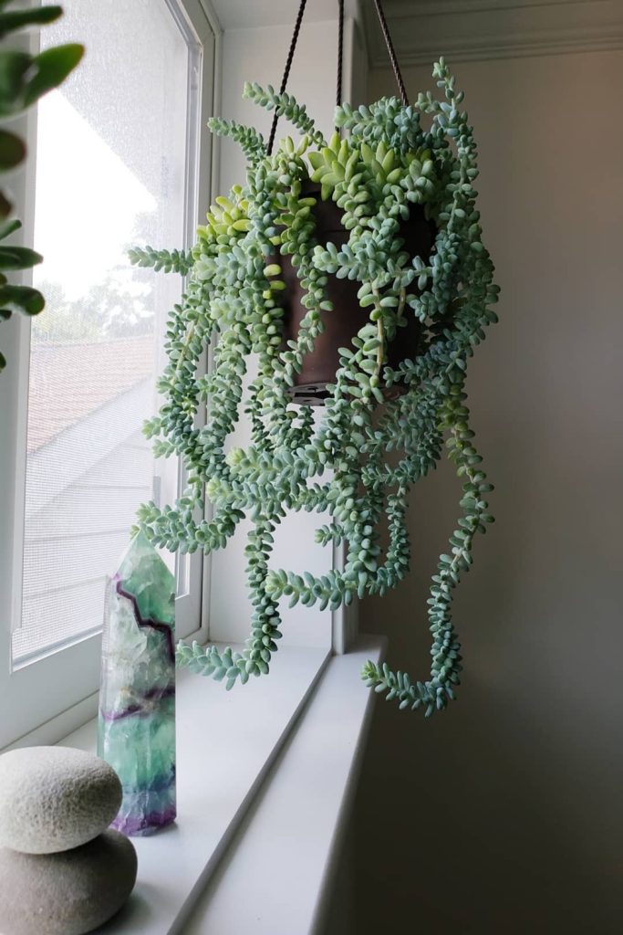 This Burro’s Tail is four feet long. I am a little jealous. It hangs high up. It is in a double rope holder. It is a main focus point over a couch. The trick to long growth: Never change the pot. Let the roots get tight in the pot. Spray the leaves with water. Do not soak the dirt much.