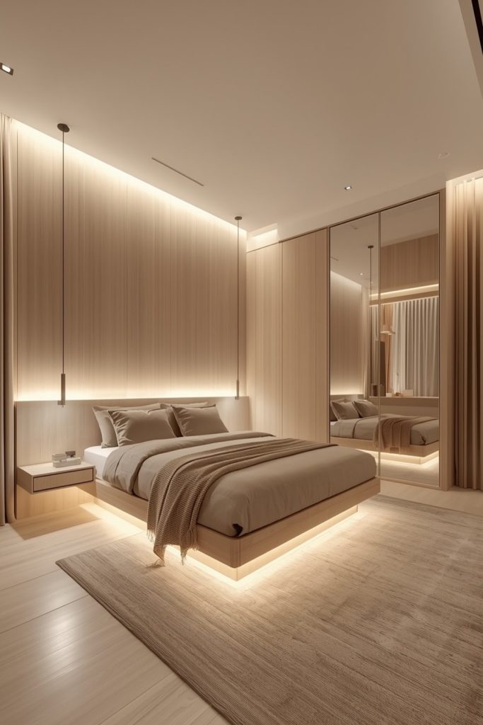 This high ceiling bedroom feels like a sweet dream. Soft pink walls and a canopy bed with light fabric make it lovely. Tiny fairy lights glow from above and bring warmth. A soft rug and velvet pillows make it even cozier. I love how this room mixes romance with a soft, airy feel. Want to make a warm love-nest? Save this for ideas and see our romantic bedroom tips. Share your favorite dreamy decor in the comments!
