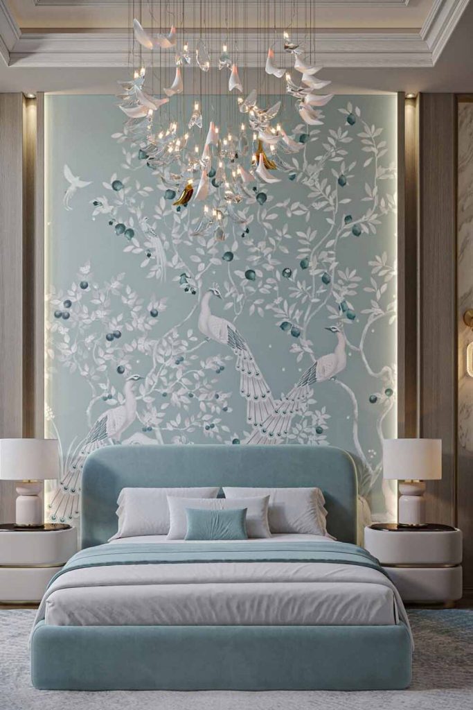 This tall bedroom is bright and bold. A teal wall pops next to cream bedding. Patterned pillows add fun colors and energy. A gold chandelier shines above, adding a fancy glow. A wooden stand gives the room balance. I love how colors and natural pieces mix here. Want to try it? Pick one strong color and fun prints. Save this for ideas and share your colorful decor below!
