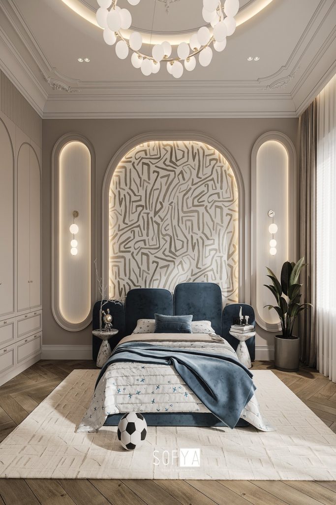 This Art Deco bedroom feels fancy and rich. A blue velvet bed pairs with gold tables. A bright light sparkles above, adding beauty. Mirrors shine and make the space look grand and cozy. I love how deep colors and soft fabrics add charm without too much drama. Want a classic style like this? Save it and check our Art Deco high ceiling tips. Share your favorite vintage looks in the comments!