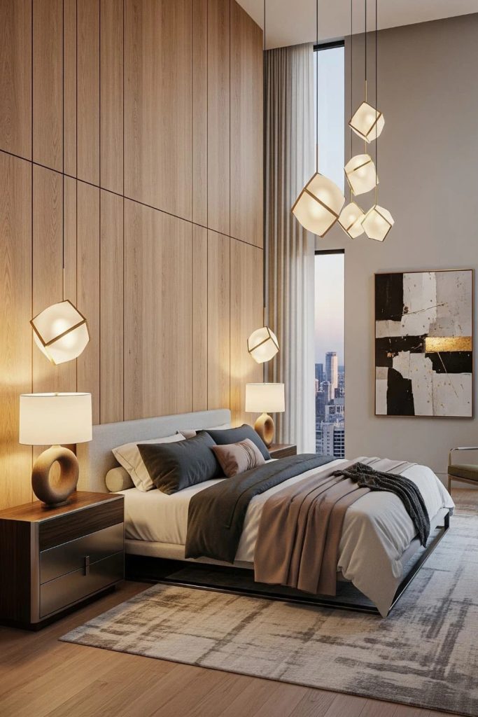 This high ceiling bedroom is bright and full of style. A blue and white accent wall stands out, and a sleek bed with mustard sheets adds warmth. A modern light hangs high, making a nice centerpiece. Bamboo tables keep it eco-friendly. I love how bold shapes make this open room fun but balanced. Want to try this look? Pin this and see our easy high ceiling design tips. Share your favorite geometric styles in the comments!