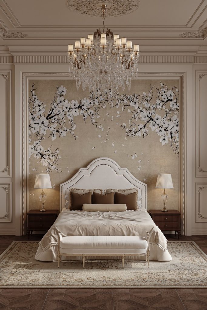This tall bedroom feels rich and soft. A green velvet headboard shines against the white bed. A crystal chandelier hangs high, giving warm, pretty light. The side tables sparkle a little. A fluffy rug feels soft under your feet. I love how comfort and glam mix here. Want this style? Add a bold color, some shine, and soft textures. It’s easy and classy!