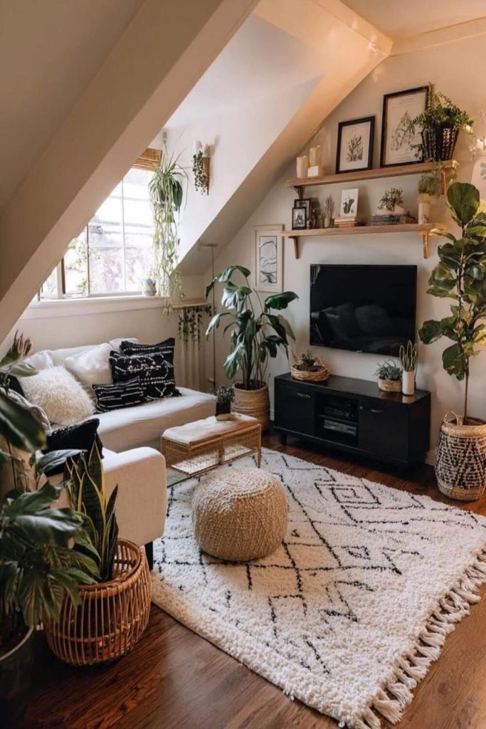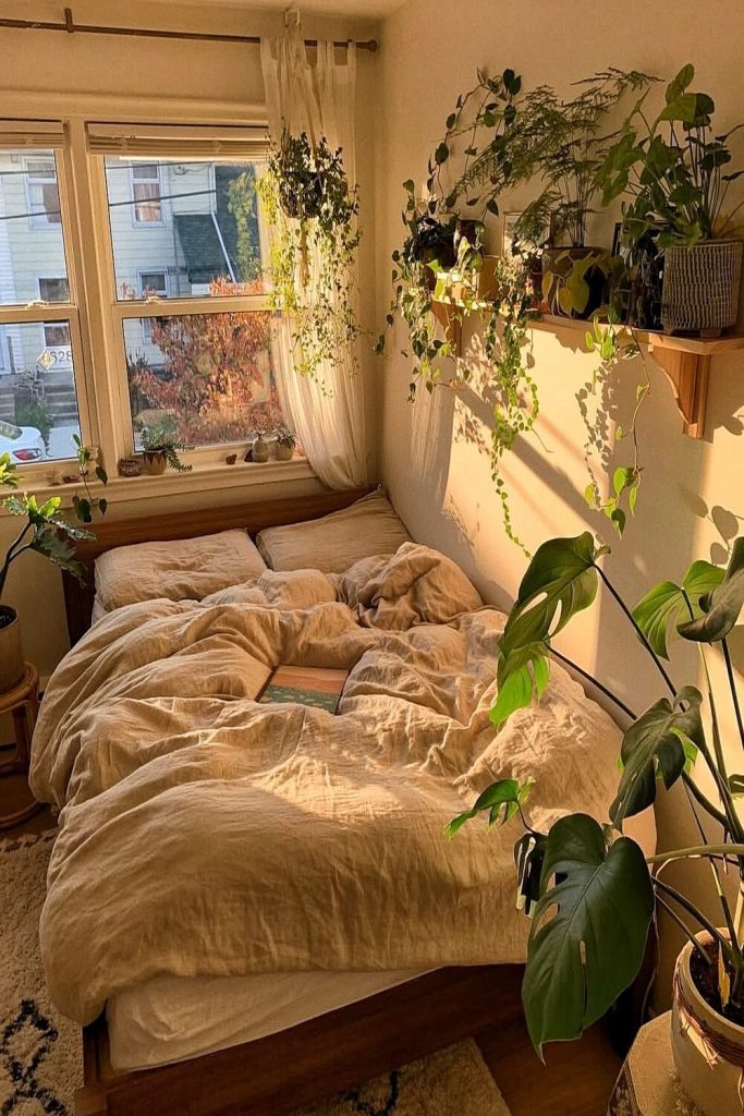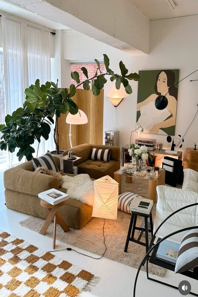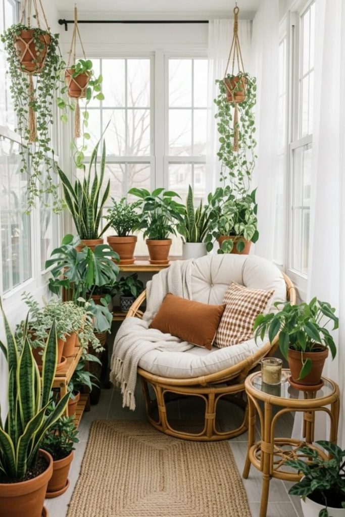 High ceilings and big windows are a plant lover’s dream! This space leans into the “more is more” philosophy with plants while keeping the furniture very “modern” and low-profile. The contrast between the industrial loft architecture and the soft, overflowing vines is breathtaking. To recreate this, use different heights for your plants—some on the floor, some on stands, and some hanging from the ceiling. It creates a lush canopy that feels like a private escape from the city.
