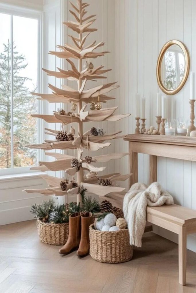 Wood is back! It is light and airy. It adds an old soul to a new room. I love a black and white pil-low on a warm wood chair. This look feels very fresh. When I style a corner, I add a tall green plant. It helps the room look tall and bright.