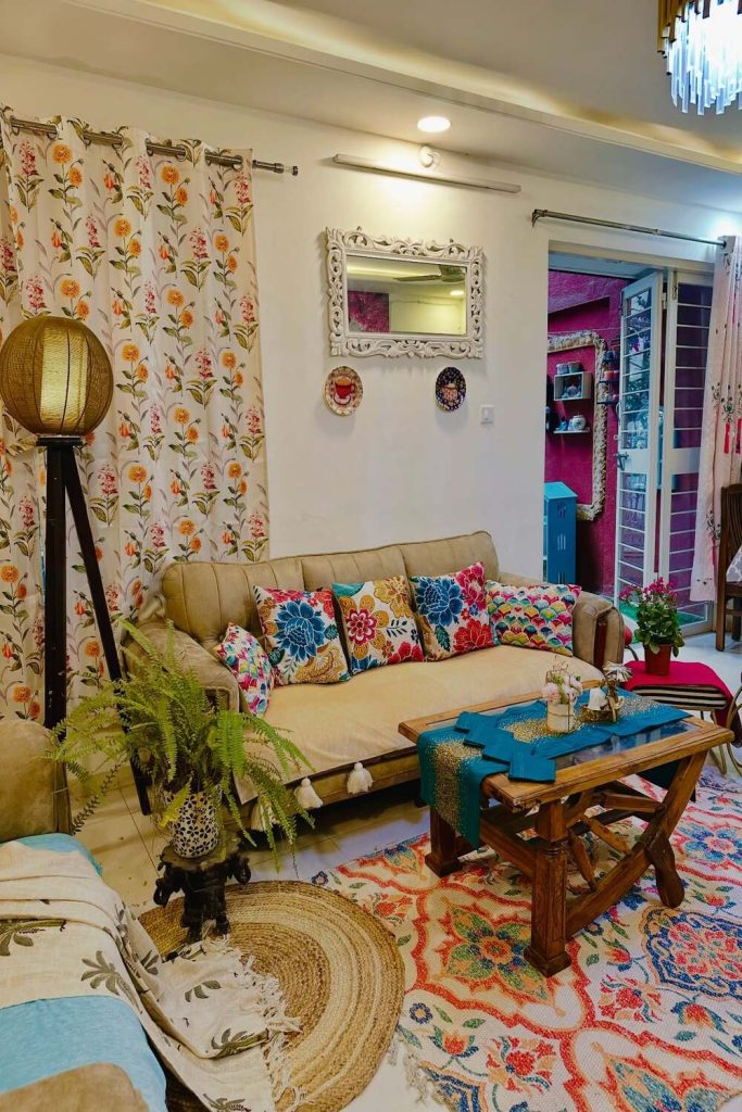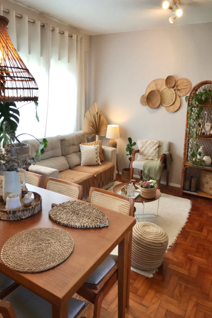 If your room feels flat, add lay-ers. Use a rough rug on the floor. Then, put a soft rug on top. This is a classic boho move. A leather stool adds a nat-ural touch. I like to mix metal and wood. A wood table looks great next to a gold lamp. These small things make a house feel like a home.