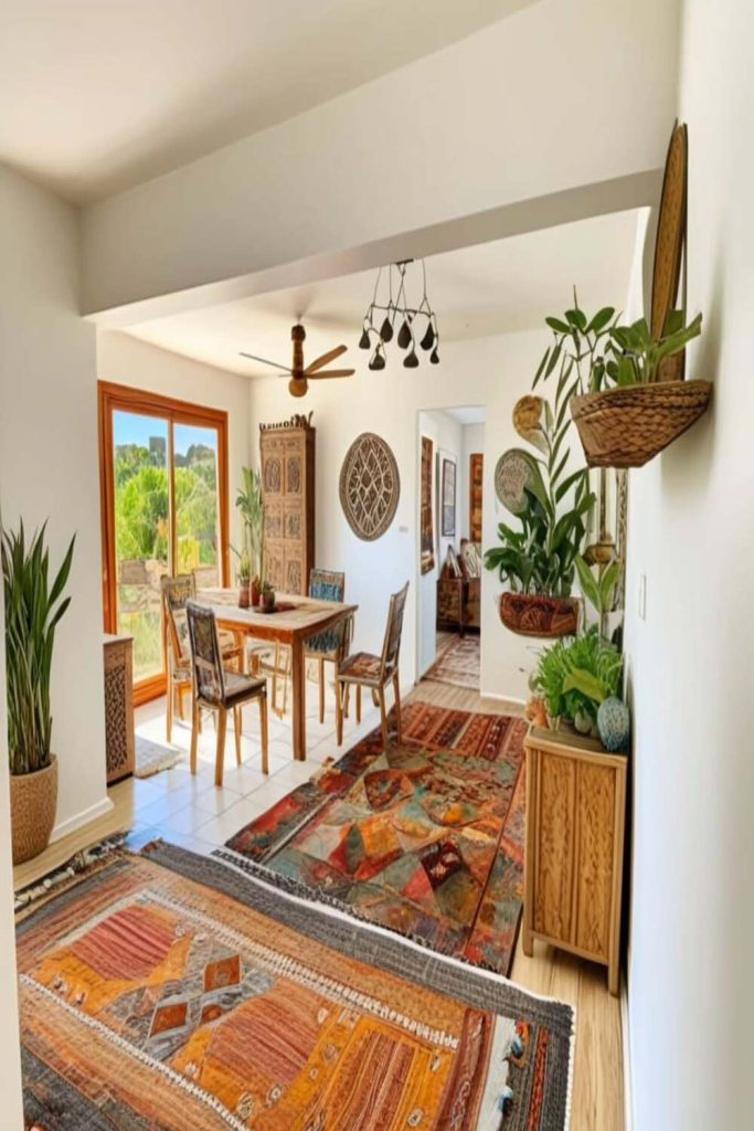 This corner is the epitome of the “chill” bohemian lifestyle. By ditching a traditional bulky sofa for a collection of oversized floor poufs and a low-profile daybed, the room feels massive and inviting. I’m a huge fan of mixing patterns—don’t be afraid to pair a Turkish Kilim rug with striped linen pillows. The secret is keeping them in the same clay and terracotta color palette. It creates a cohesive look that feels collected over time rather than bought from a catalog. It’s the perfect spot for a Sunday afternoon nap or coffee with friends.