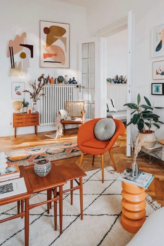 Your bed room should feel like a deep breath. This room uses colors like rust and clay. The art on the wall has clean shapes for a new look. Soft pillows keep the “boho” soul a-live. Here is a tip: if you use bright orange, add a lot of white. This keeps the room feel-ing light. Make the bed the main part of the room.