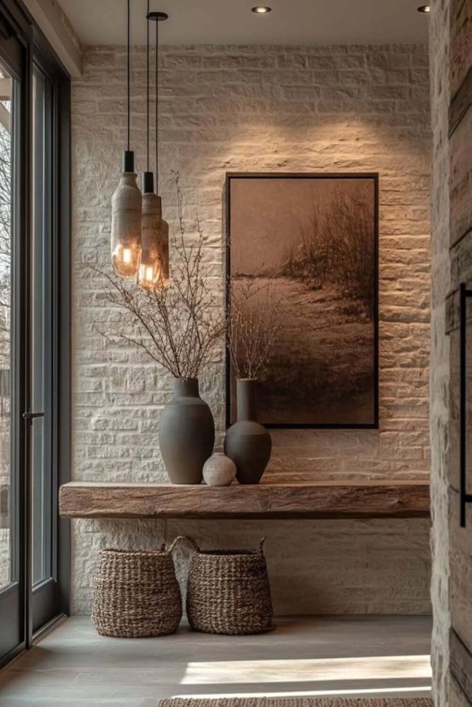 This entryway is a stunning nod to the Afrohemian trend that’s taking over Pinterest. It’s all about honoring heritage through handwoven baskets and carved wooden stools, but notice how the clean, white walls keep it firmly in the “modern” camp. I love using a console table with a sharp, iron frame to ground the more organic, textured pieces like a Nigerian textile runner. It’s a space that says “welcome home” with a story to tell. If you’re trying this at home, start with one large artisan piece and build around it with neutral, sustainable materials.
