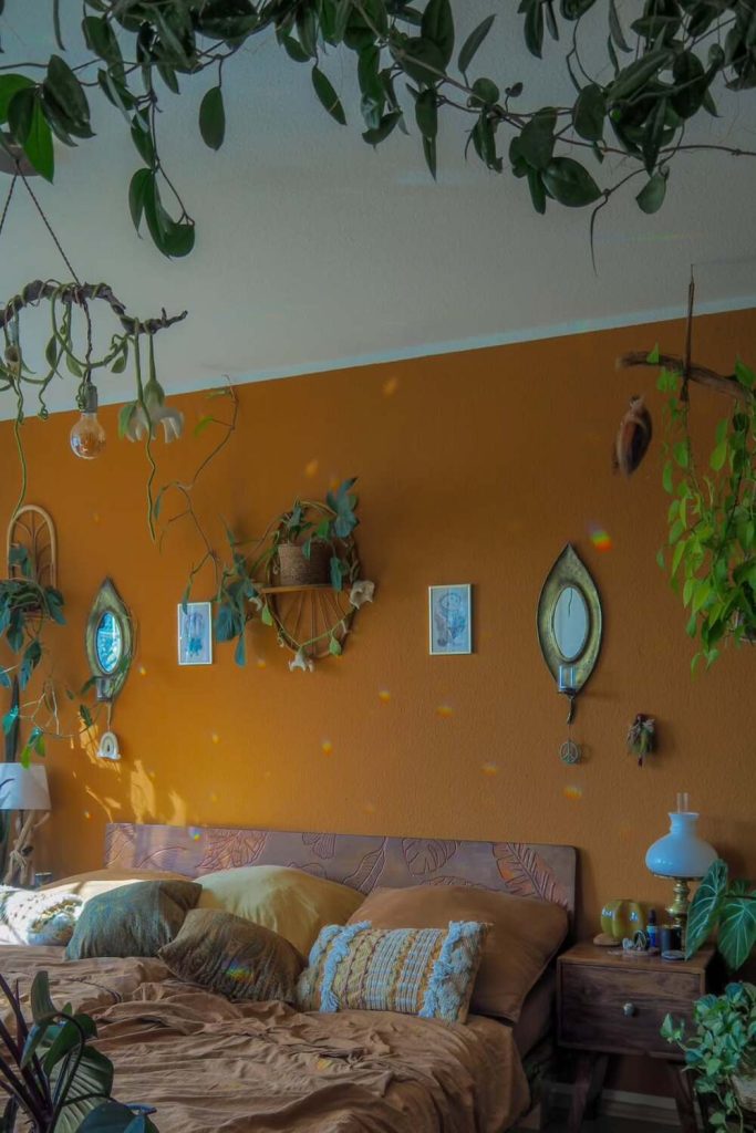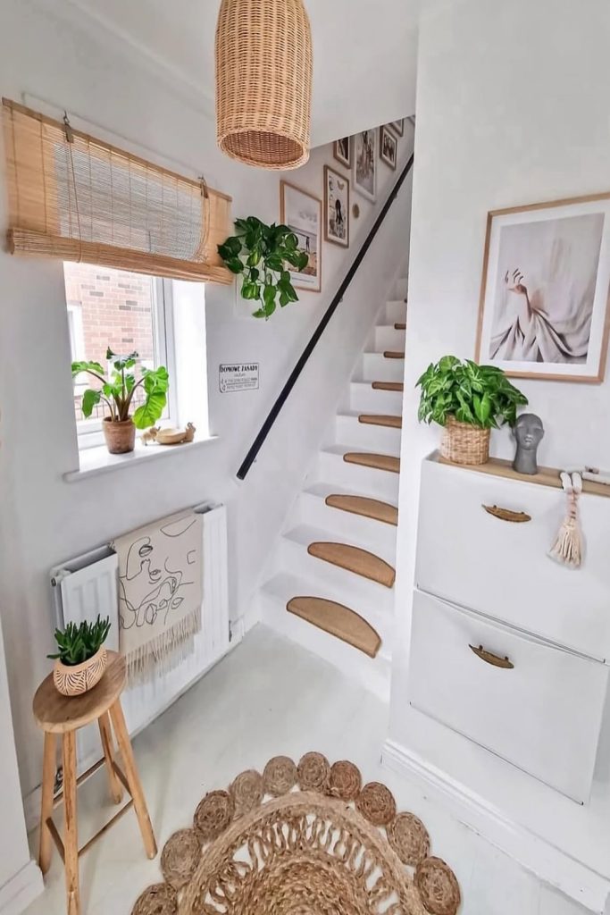 Boho style does not have to be a mess. This is “simple” at its best. Use wood shelves for your plants. This gives a lush feel with-out tak-ing up floor space. I love black metal with light wood. It looks new and cool. This is great for those who rent. A few green plants can make a dull hall-way look a-live.