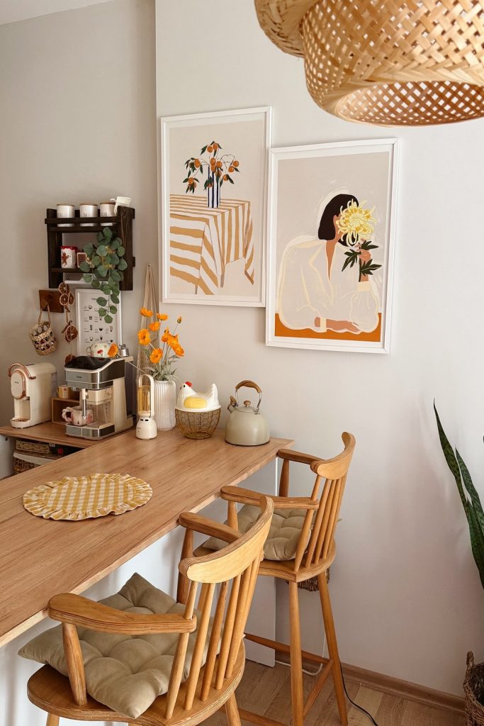 Mak-ing an art wall can seem hard. But this way looks easy. Mix plain art with leaf prints. Use wood frames to keep it per-sonal. Keep the gaps the same. This style links clean lines with fun art. Do not be a-fraid to use many frame sizes. It keeps the wall look-ing fun.