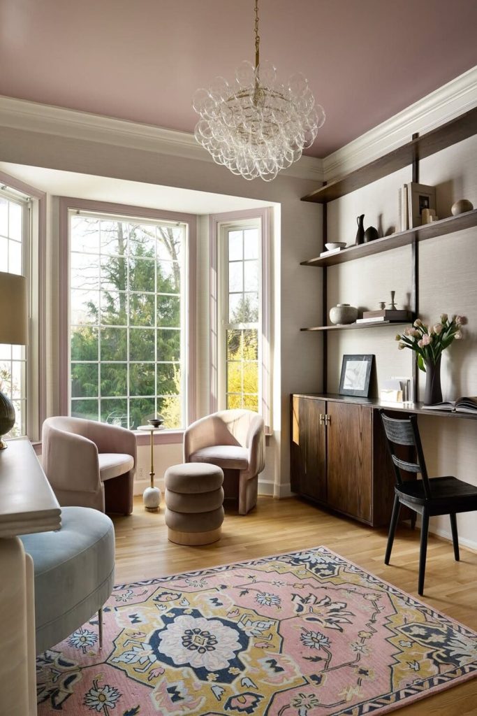 This playful room is full of charm! A small desk pairs with a colorful daybed. Jewel-tone pillows add bright pops. Light wood floors and a woven rug keep it grounded. Floating shelves save space. The bright vibe helps work and welcomes guests. Want a fun, useful room? Mix bold colors with smart storage. Share your tips in the comments!