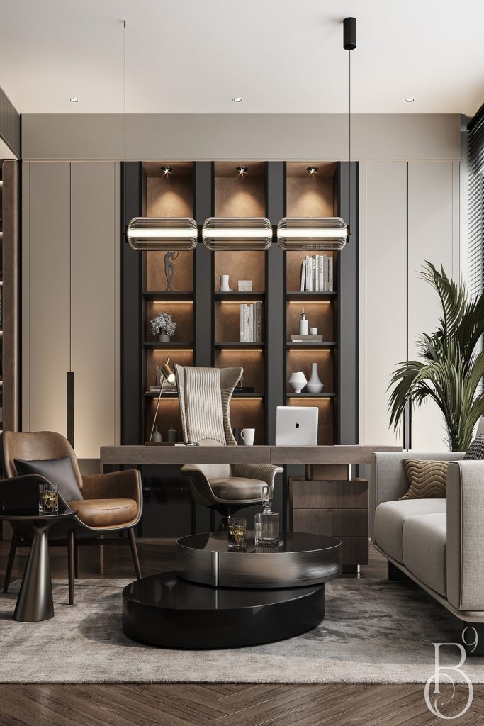 This sleek modern space is stylish! A minimalist desk doubles as a bedside table. A Murphy bed tucks away neatly. Cool gray colors feel calm and fresh. Built-in lights highlight the desk. The layout fits small spaces without losing style. Want a modern feel? Pick clean furniture and neutral colors for a chic office and guest room.