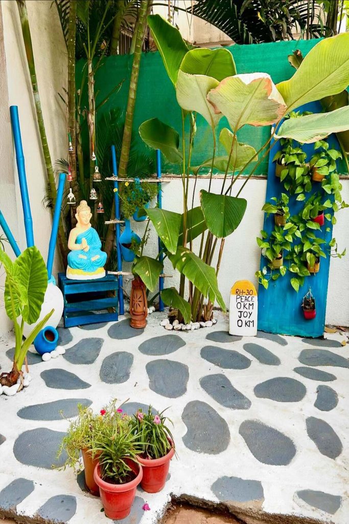 Creating a quiet spot for reflection is a top priority for many of my readers. This Buddha statue, nestled among lush ferns and bamboo, is the definition of tranquility. The use of dark slate rocks and a small trickling fountain adds both texture and sound to the space. When setting up a “Zen corner,” I always tell people to focus on different shades of green rather than too many flowers—it keeps the visual energy calm and focused. It’s a perfect slice of paradise for a traditional Indian patio.